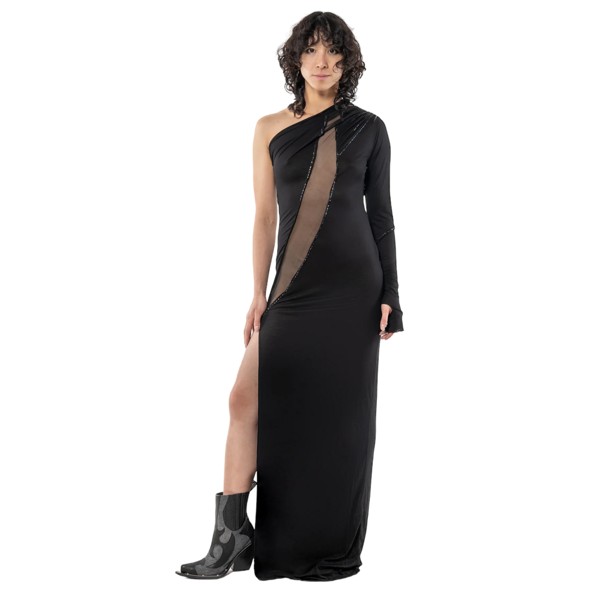 Elevate your style sustainably with the ANESU Dress by pushing the boundaries of binary fashion. Its silk chiffon middle panel exudes elegance, while the body is made of 100% biodegradable Ecovero Jersey and embraces eco-consciousness. Handsewn glass beads adorn shoulder gatherings, and a single long sleeve with a thumbhole adds flair. The high side slit and straight cut offer both allure and sophistication dedicated to the highest craftsmanship and quality in avant-garde fashion.