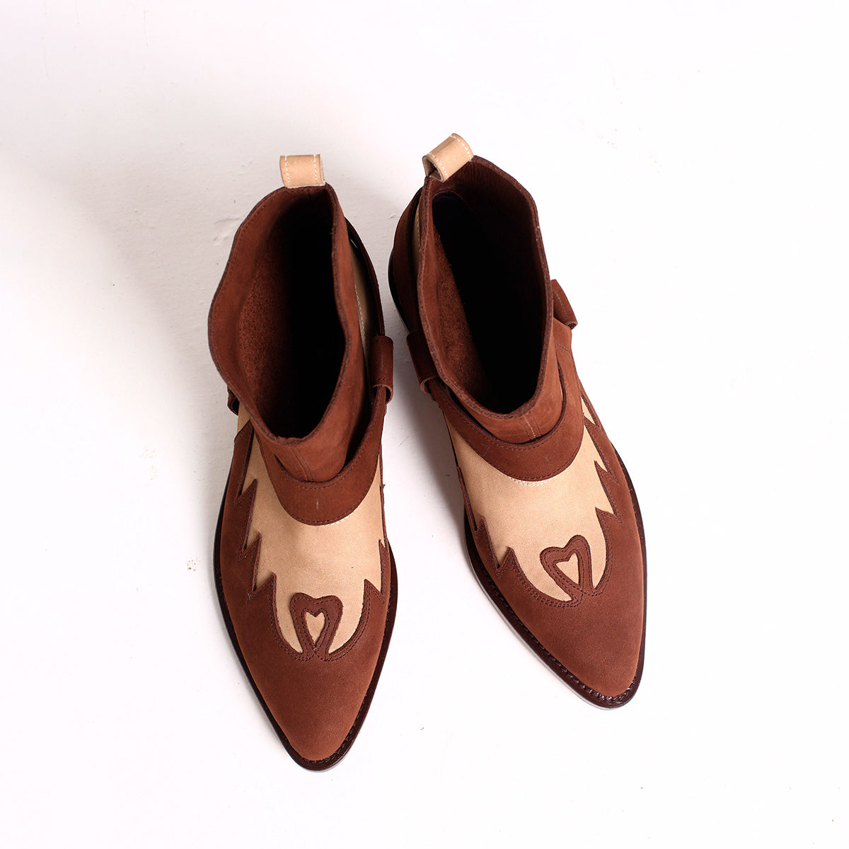 Suede ankle boots are reminiscent of dark chocolate and hot cocoa. They have a unique metal ring and beautiful light accents on the vamp. This pair blends classic suede sophistication with modern details, making it a versatile and stylish choice for various outfits. Add them to your favorite look and make it unforgettable.