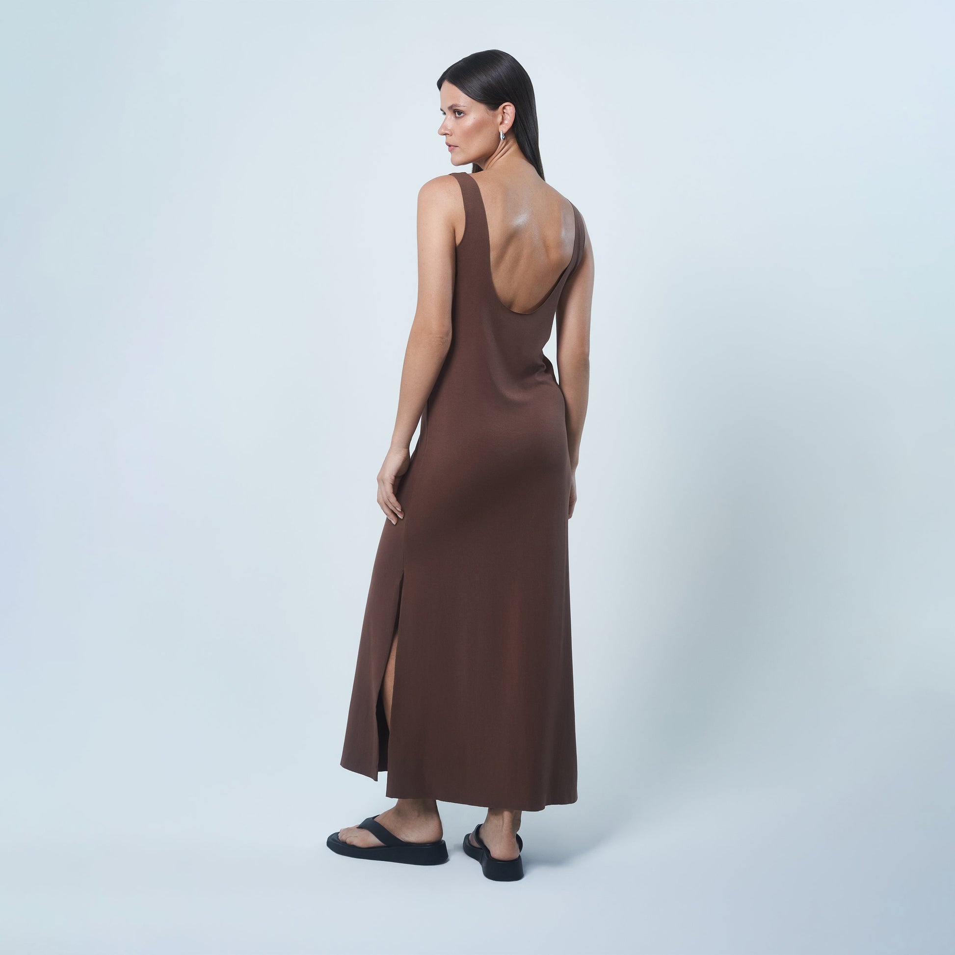 Raw cut dress. Simplicity combined with refined tailoring. Open back, slits, slightly fitted silhouette make this model a perfect item for casual elegant look.