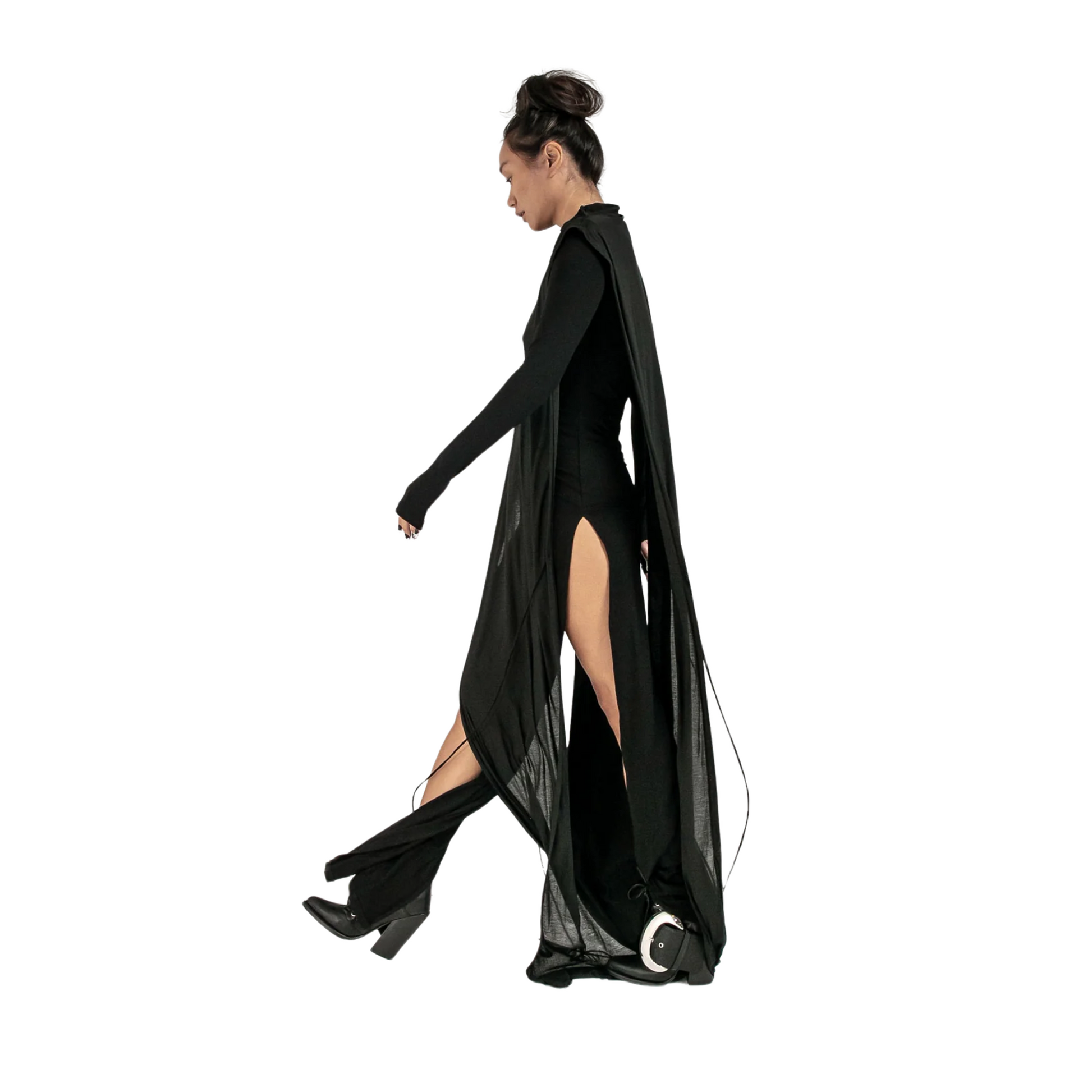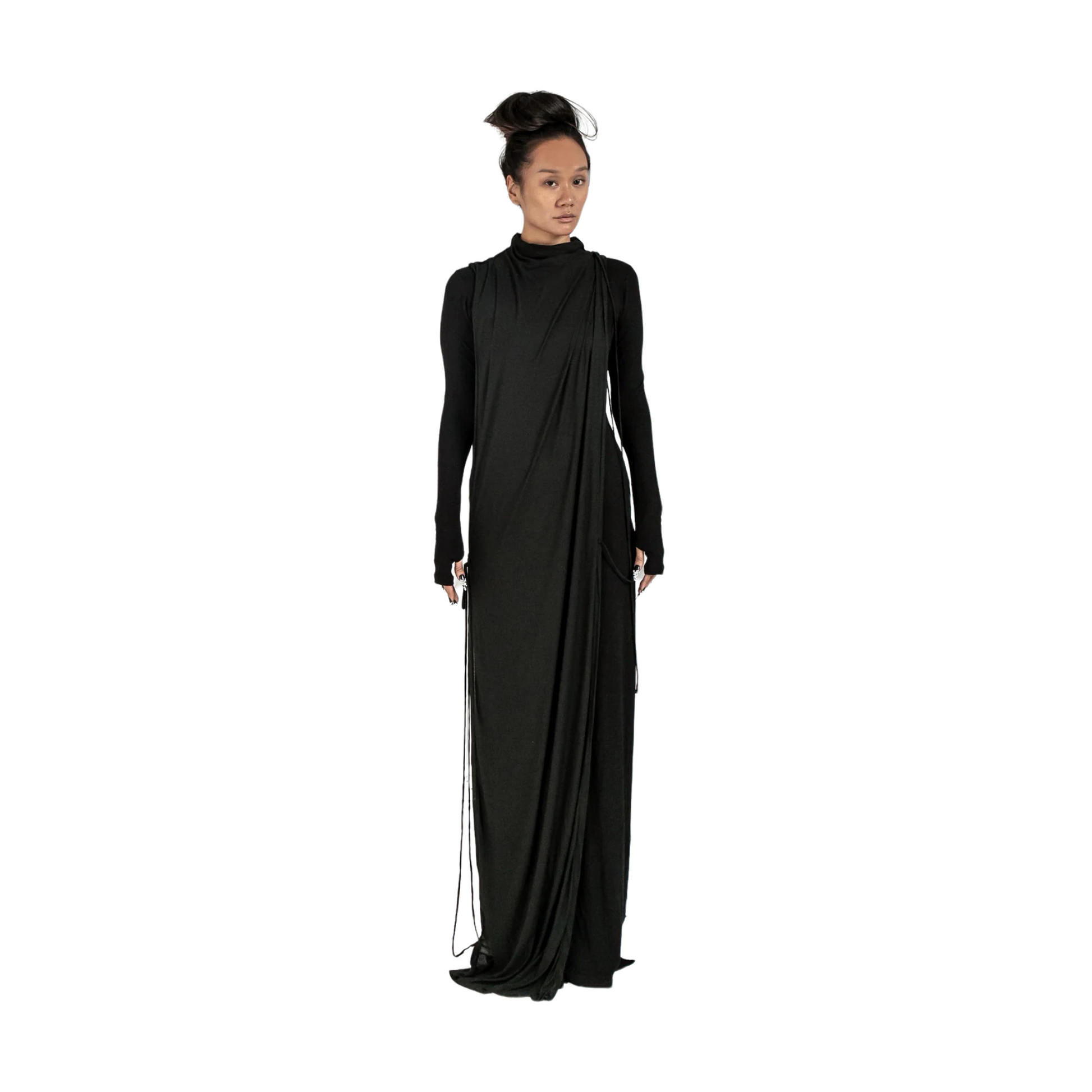 Introducing the black deconstructed layered dress from our AEQUALIS collection - the perfect choice for those who love to layer! With its unique gender-neutral design, cut-out details, and turtleneck, this dress is the ultimate statement piece. The long sleeves and back tie fastening on the side add an extra touch of style and sophistication, while the straight low hem provides a flattering silhouette.