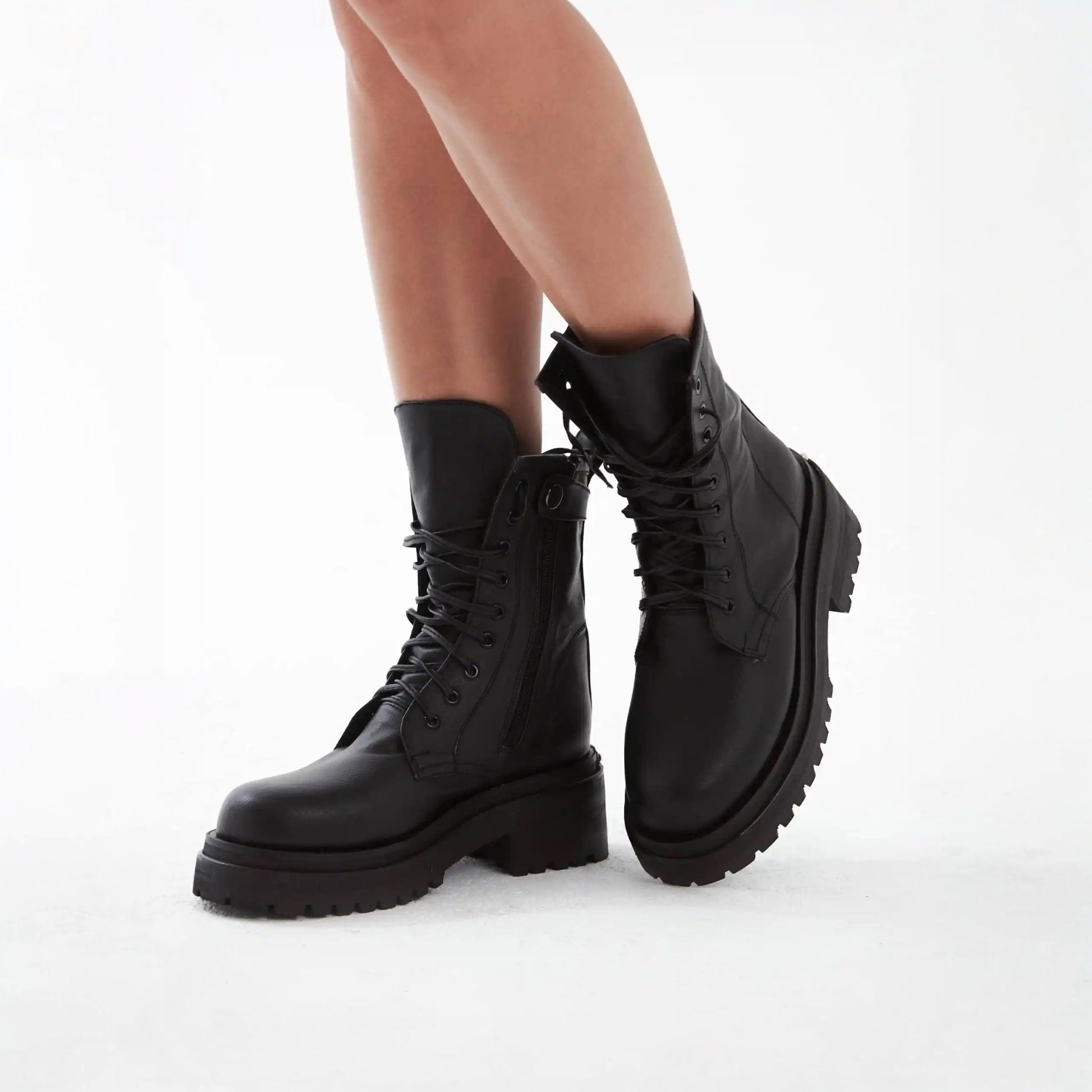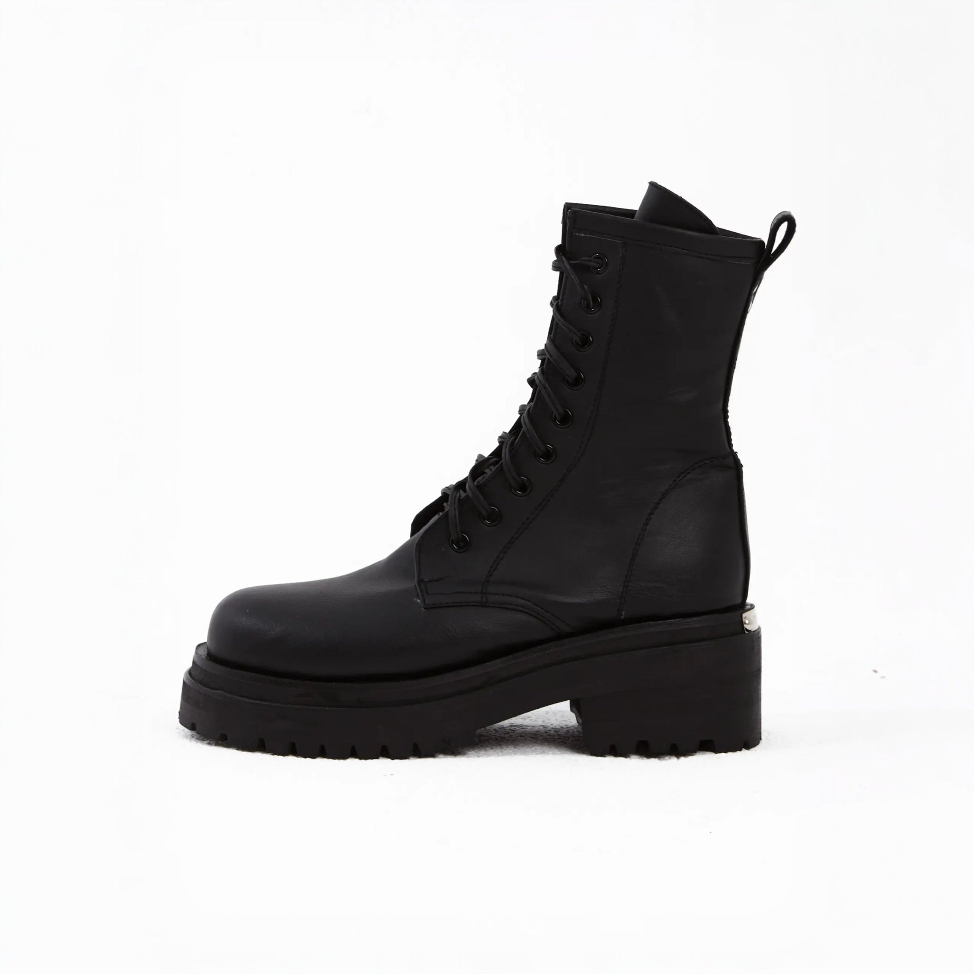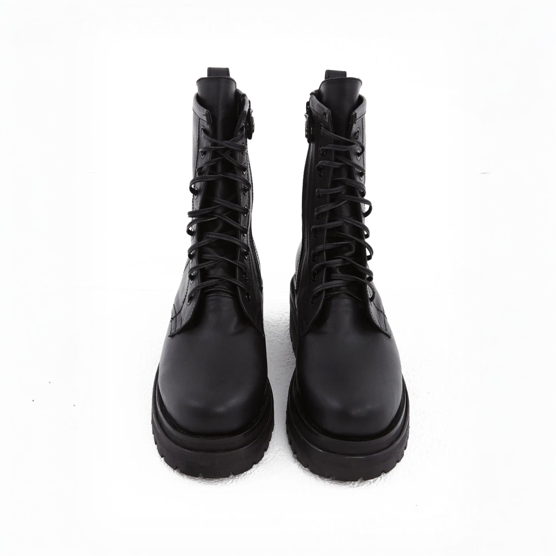Rough military style boots made of genuine leather. Lacing 9 holes. Hand-sewn leather laces. Thick but lightweight rubber sole. Side zipper with protective fastening. Iron logo on the back.