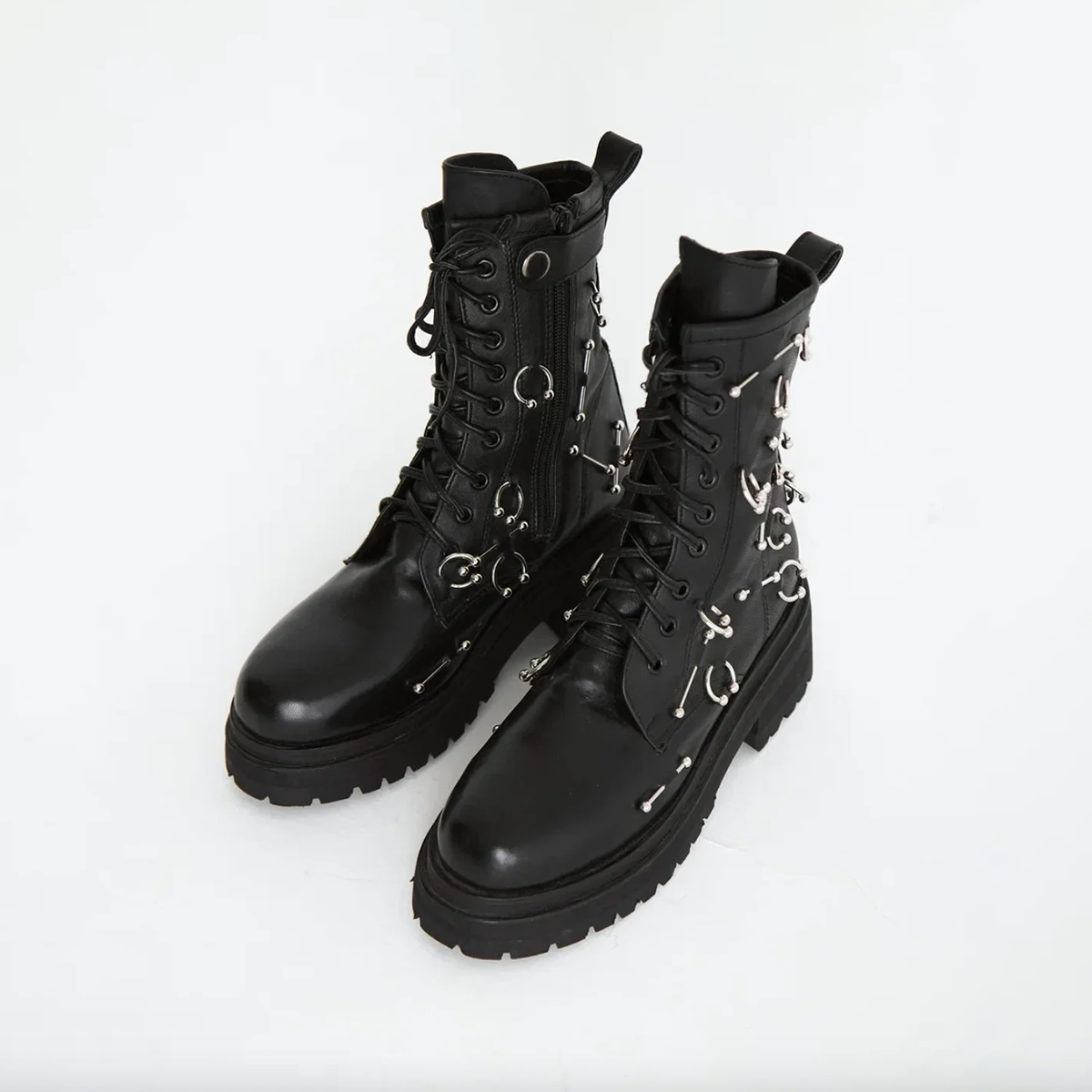 These unique handmade boots are a real find for those who are not afraid to stand out. Decorated with metal elements in the style of piercing, they attract attention and add expressiveness to the image.