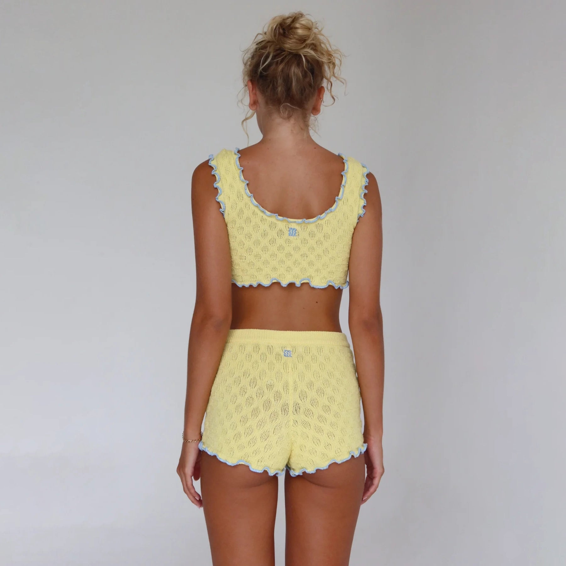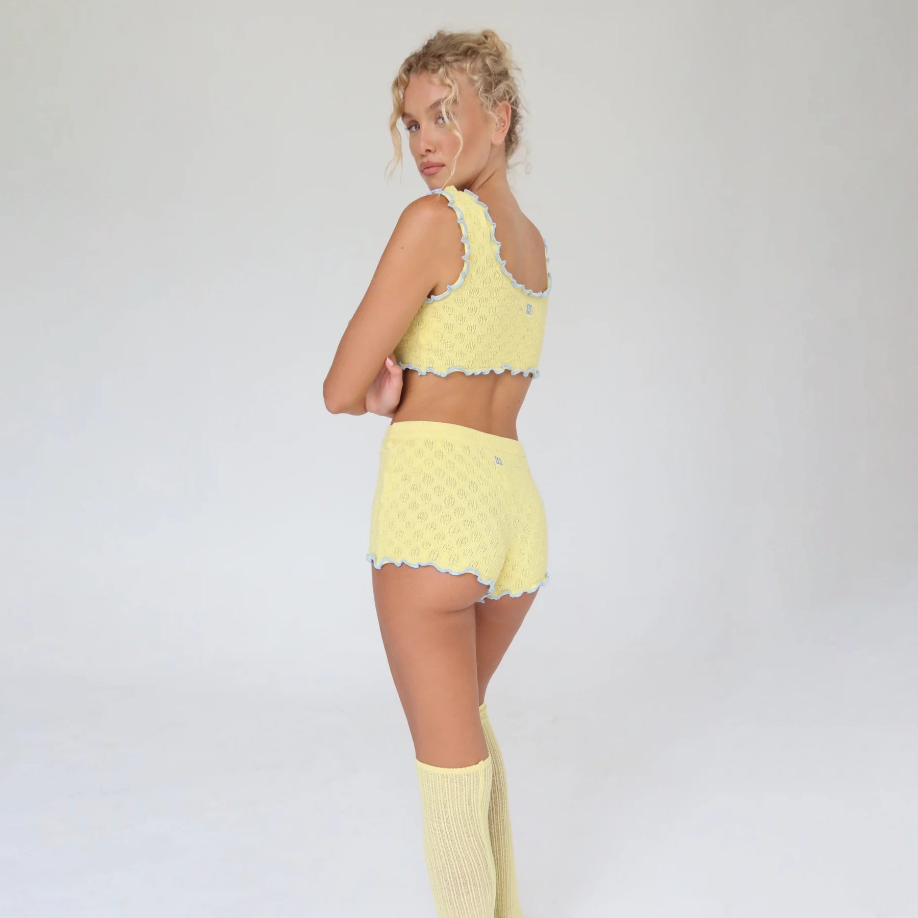 The Cheeky Knit Shorts are body-hugging knit shorts inspired by vintage lingerie silhouettes, designed to highlight the legs and pair effortlessly with the Cheeky Knit Top.