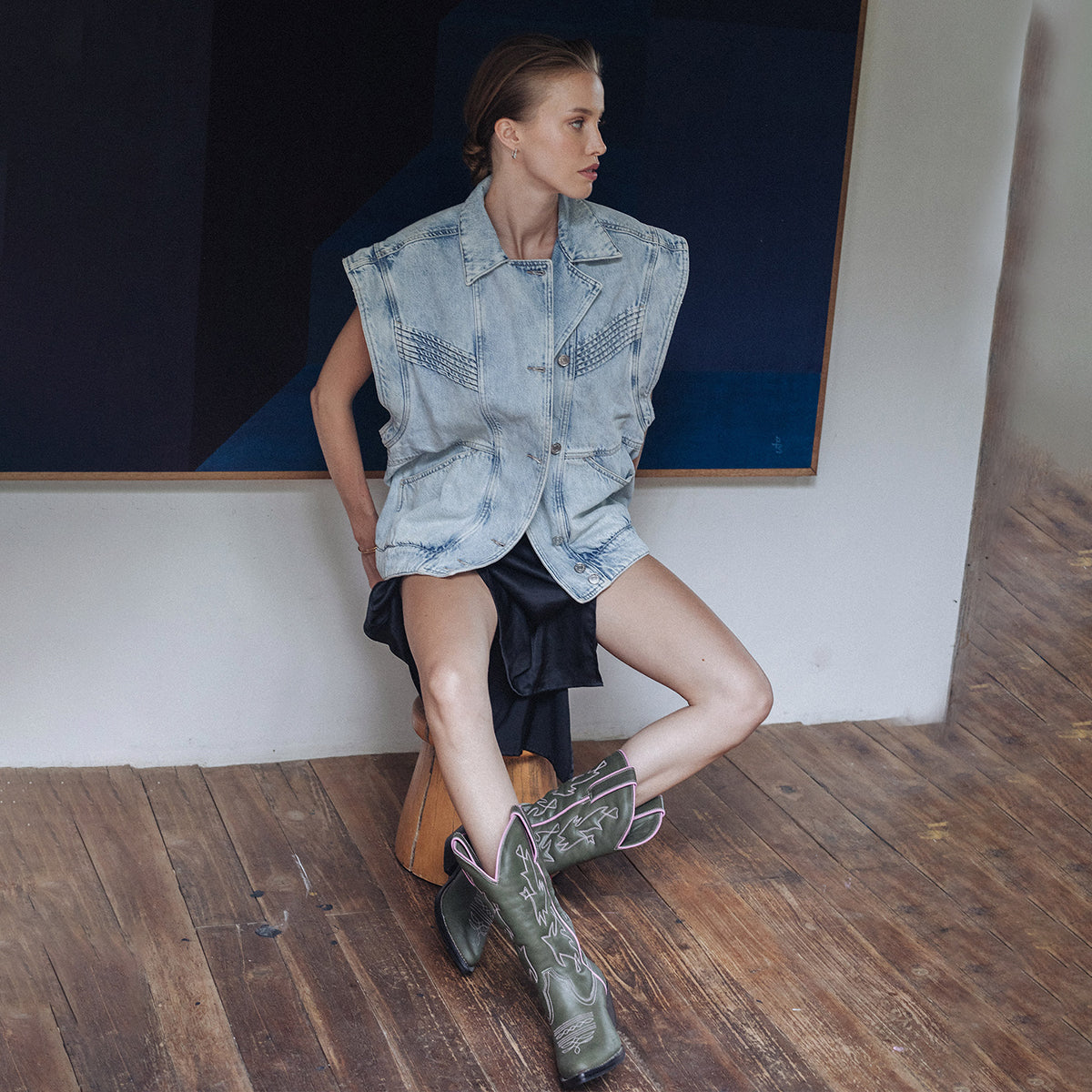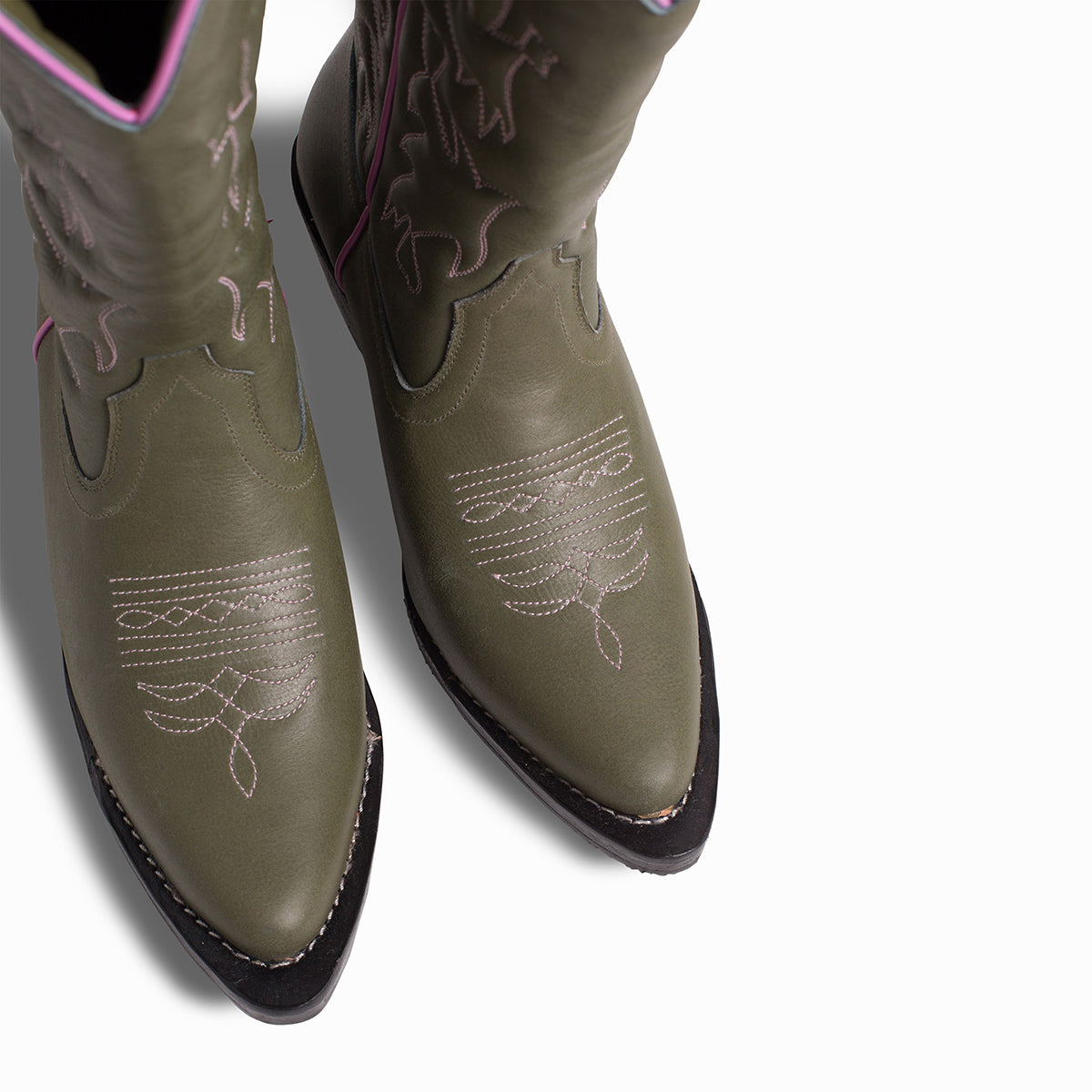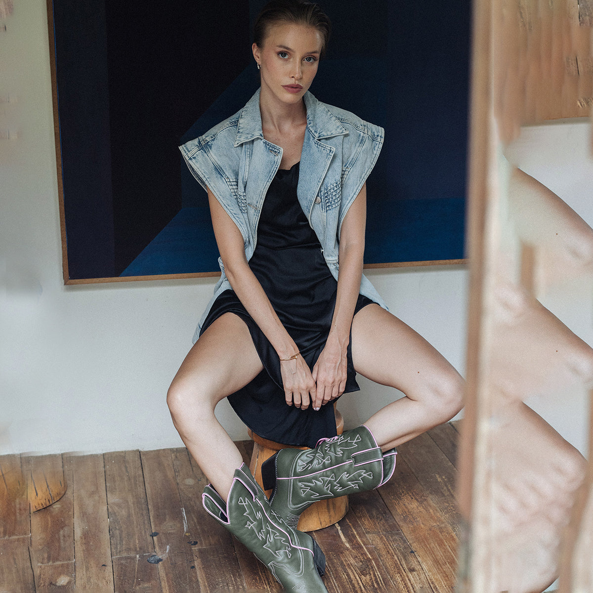 These unusual green cowboy boots with intricate pink patterns evoke a sense of boldness and adventure. They combine style and boldness, making them ideal for the spicy looks. With these boots, you will guarantee to stand out and express your fearless spirit.