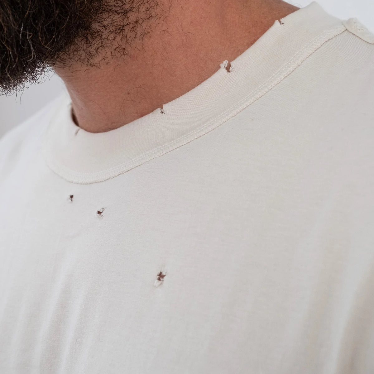 Each piece is carefully hand-distressed, dyed, and ripped, ensuring no two garments are alike.