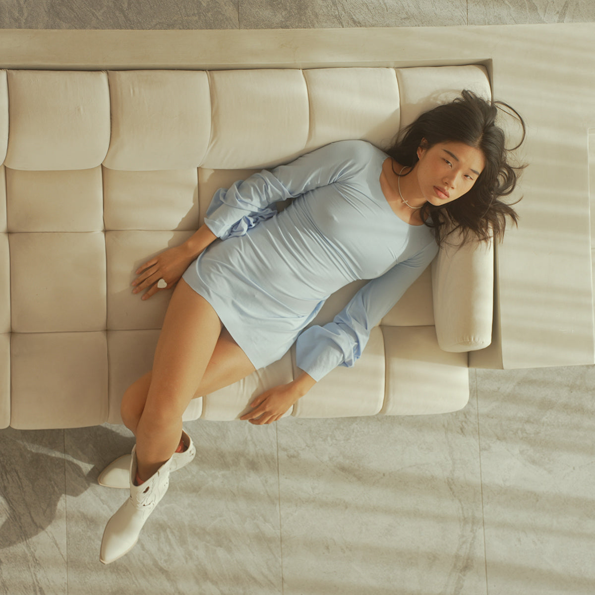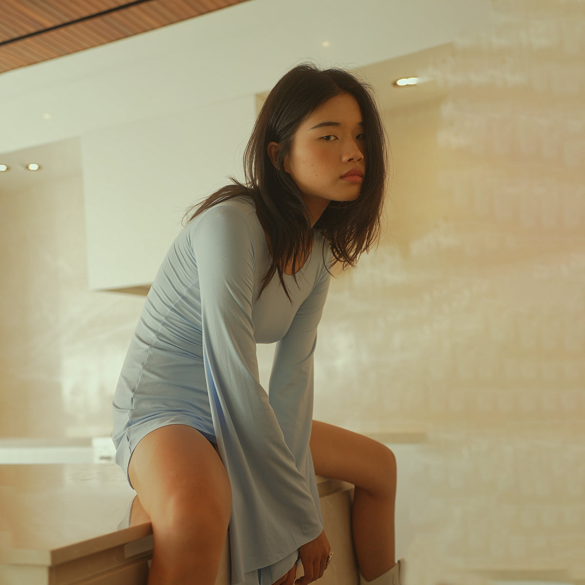 Smart mini dress with a focus on a long flared sleeve. Nothing extra: raw cut, a highlighted waist pattern will create a pleasant silhouette. Wear it with casual shoes or sneakers for a playful girly look, or take the outfit into boho with boots and a large shopper.