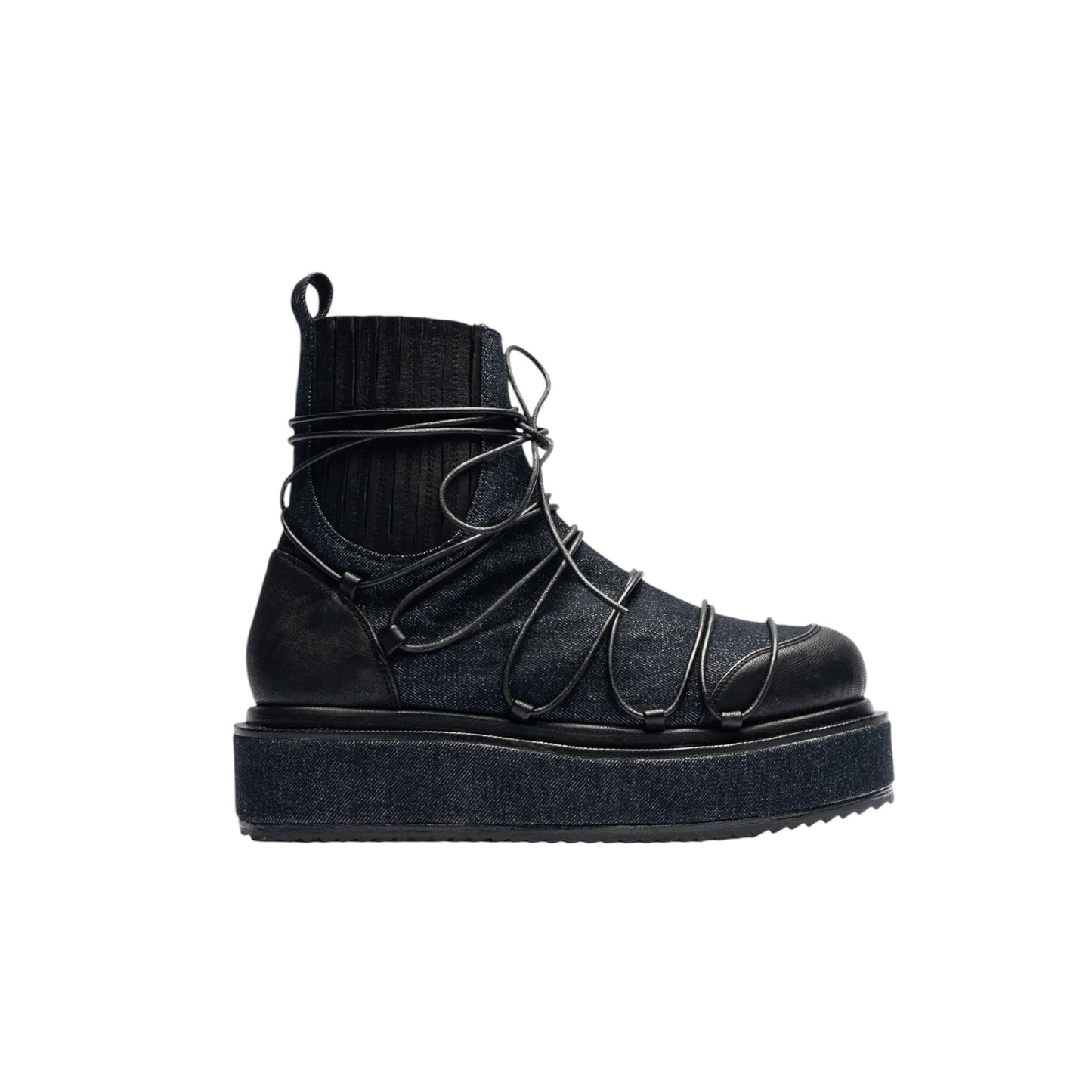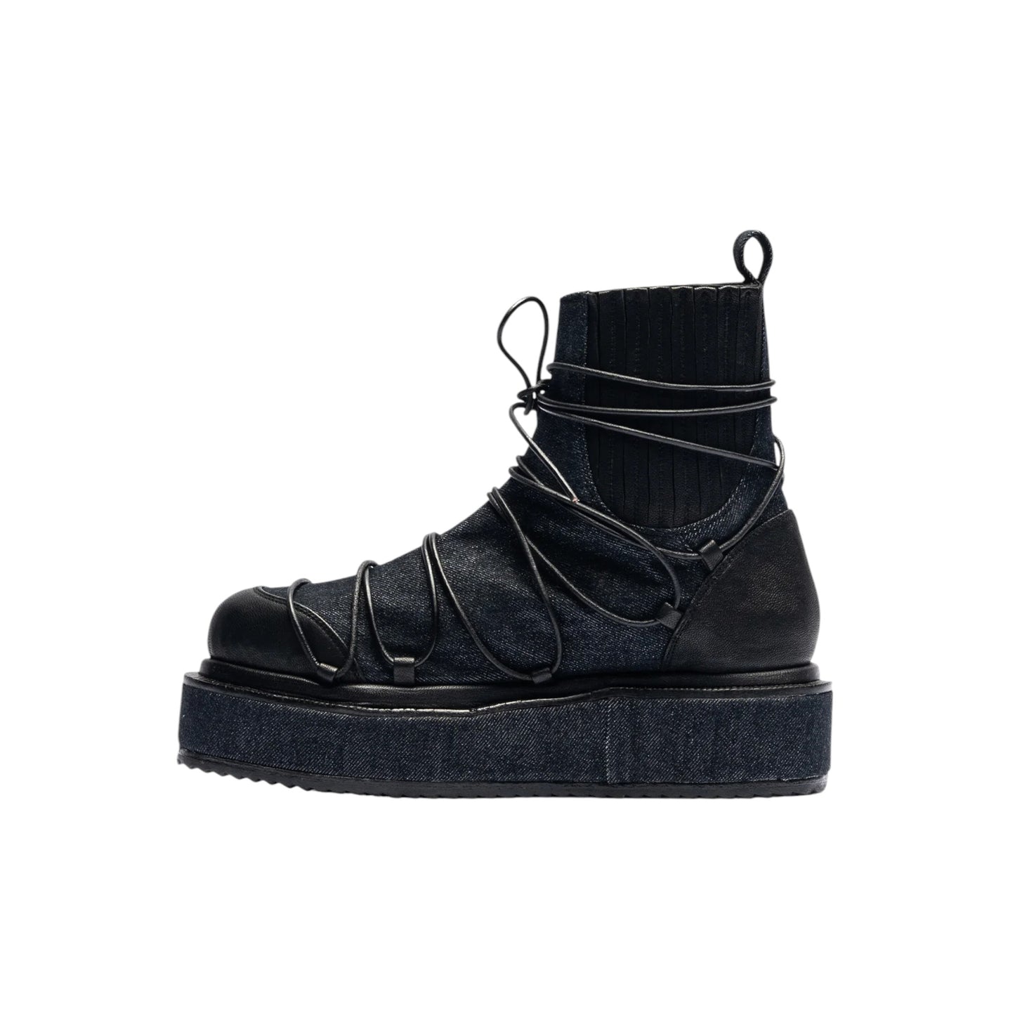Combining the casual feel of Denim with the durability of leather, the FIN BOOTS offer a unique style and lasting quality. Each pair is tailored to your exact measurements, ensuring a perfect fit and unparalleled comfort. The leather-covered platform adds boldness and durability, while the ankle-high elastic ensures easy slip-on comfort. A leather string zig-zags across the surface, serving as a decorative and functional feature.