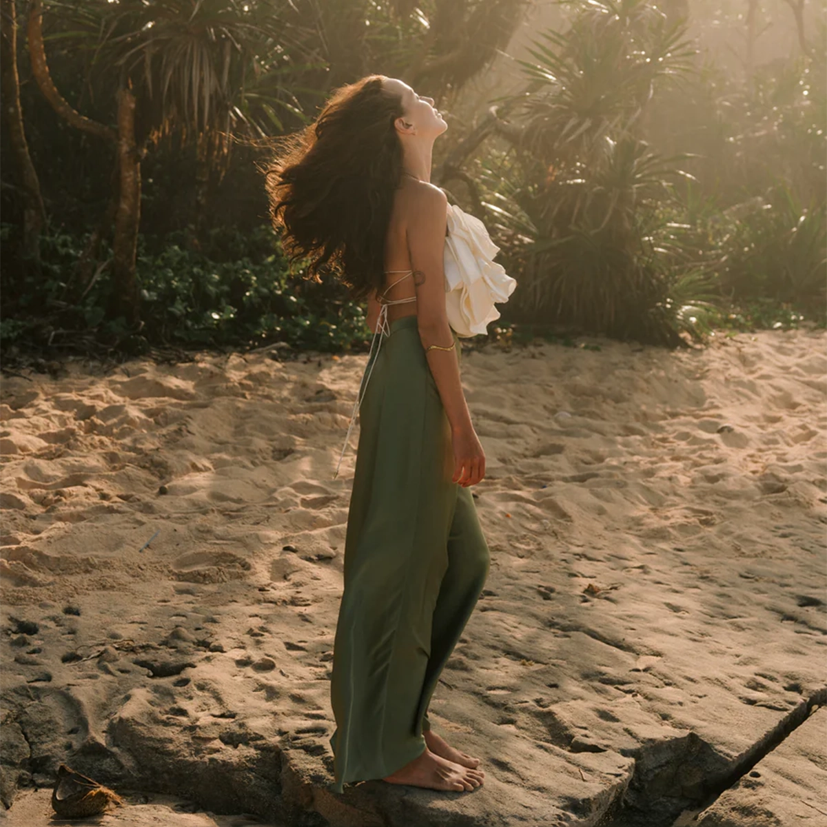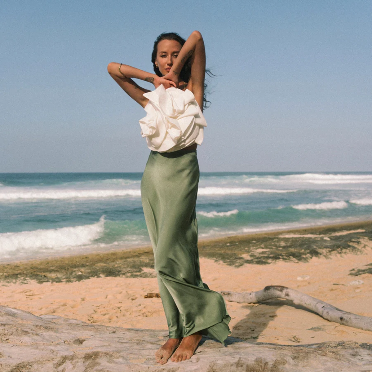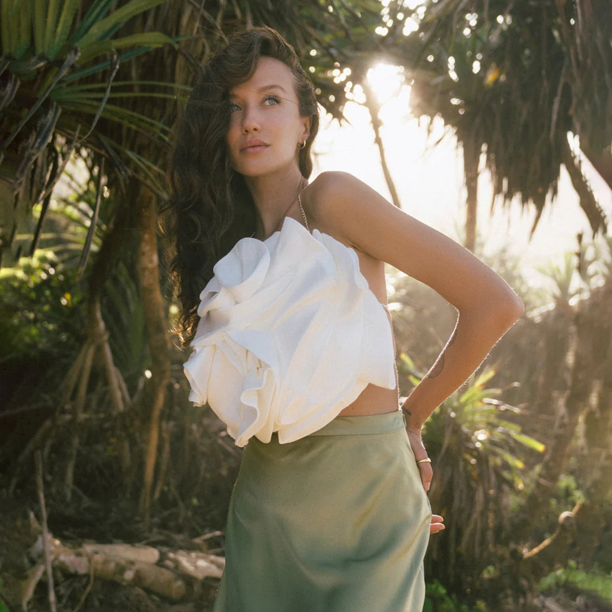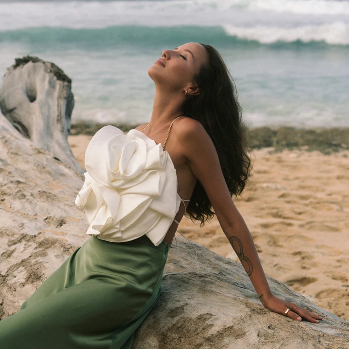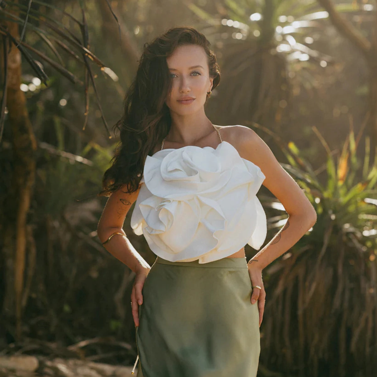Signature handcrafted top featuring a sculptural floral design, combining artistry with elegance.