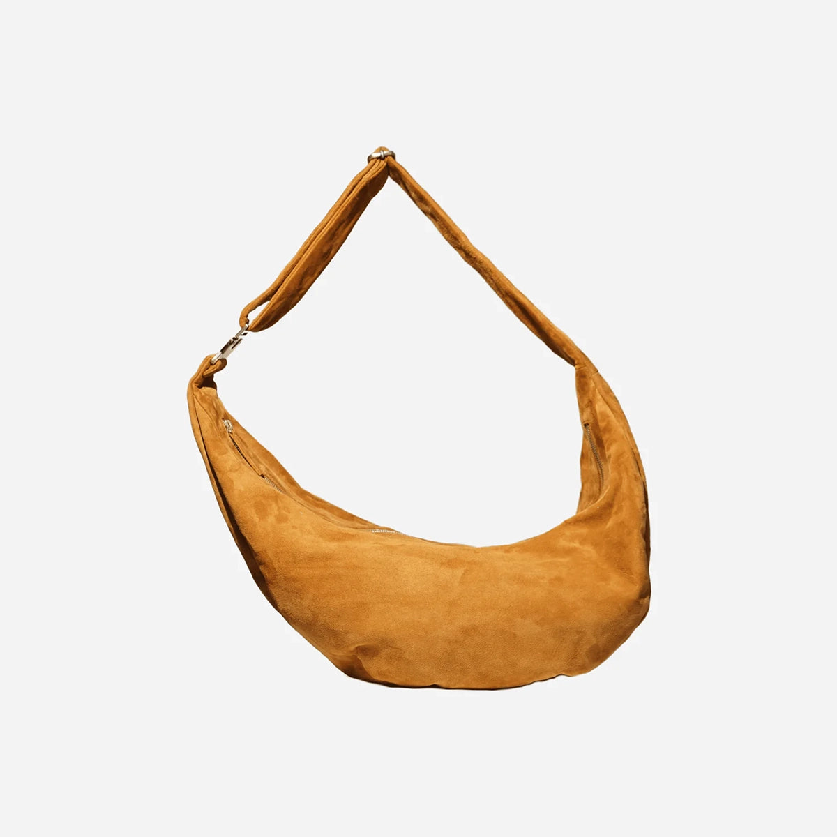 Introducing the refined Fall/Winter edition of 'The Gabriel,' a timeless banana bag reimagined in rich suede for an effortlessly chic, cold-weather look. Available in four sophisticated shades—olive, taupe, chocolate, and camel—this versatile bag is the perfect fusion of style and functionality, ideal for any wardrobe.
