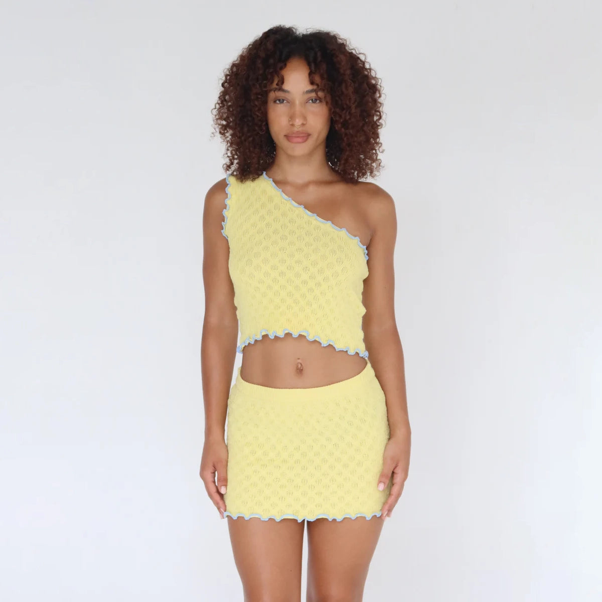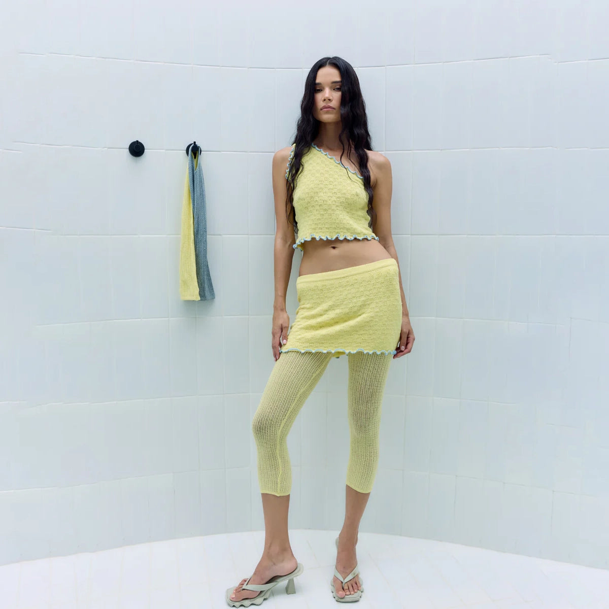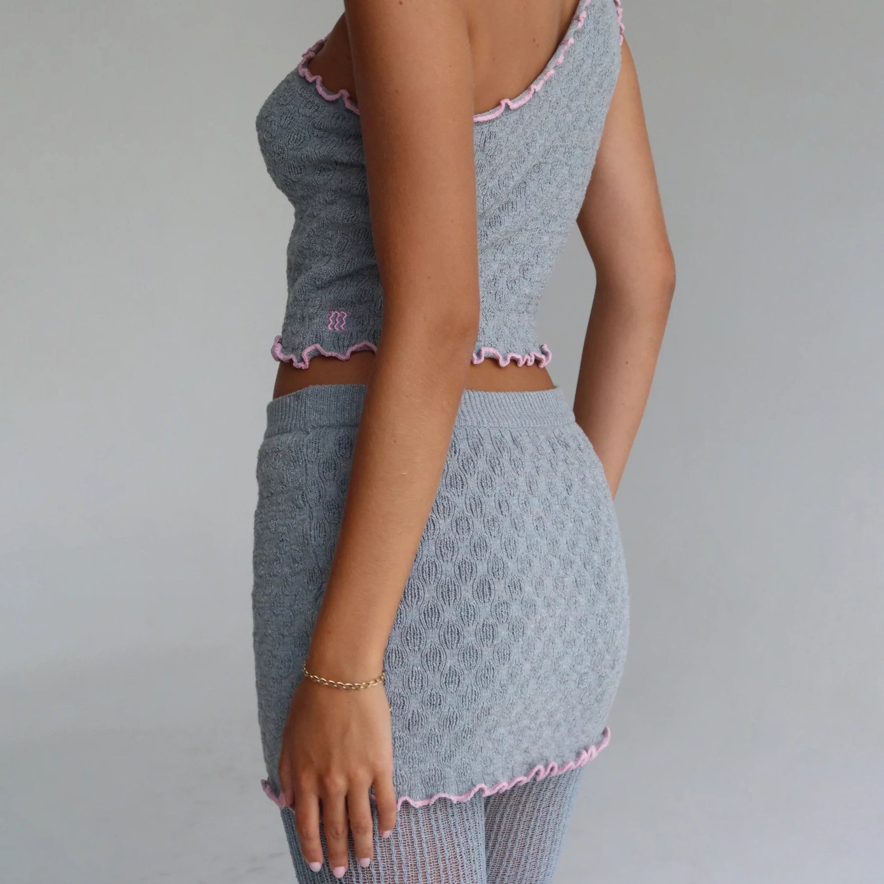 The Gardenia Knit Mini Skirt highlights the legs with a clean, body-contouring silhouette that softly follows the natural curves of the hips.