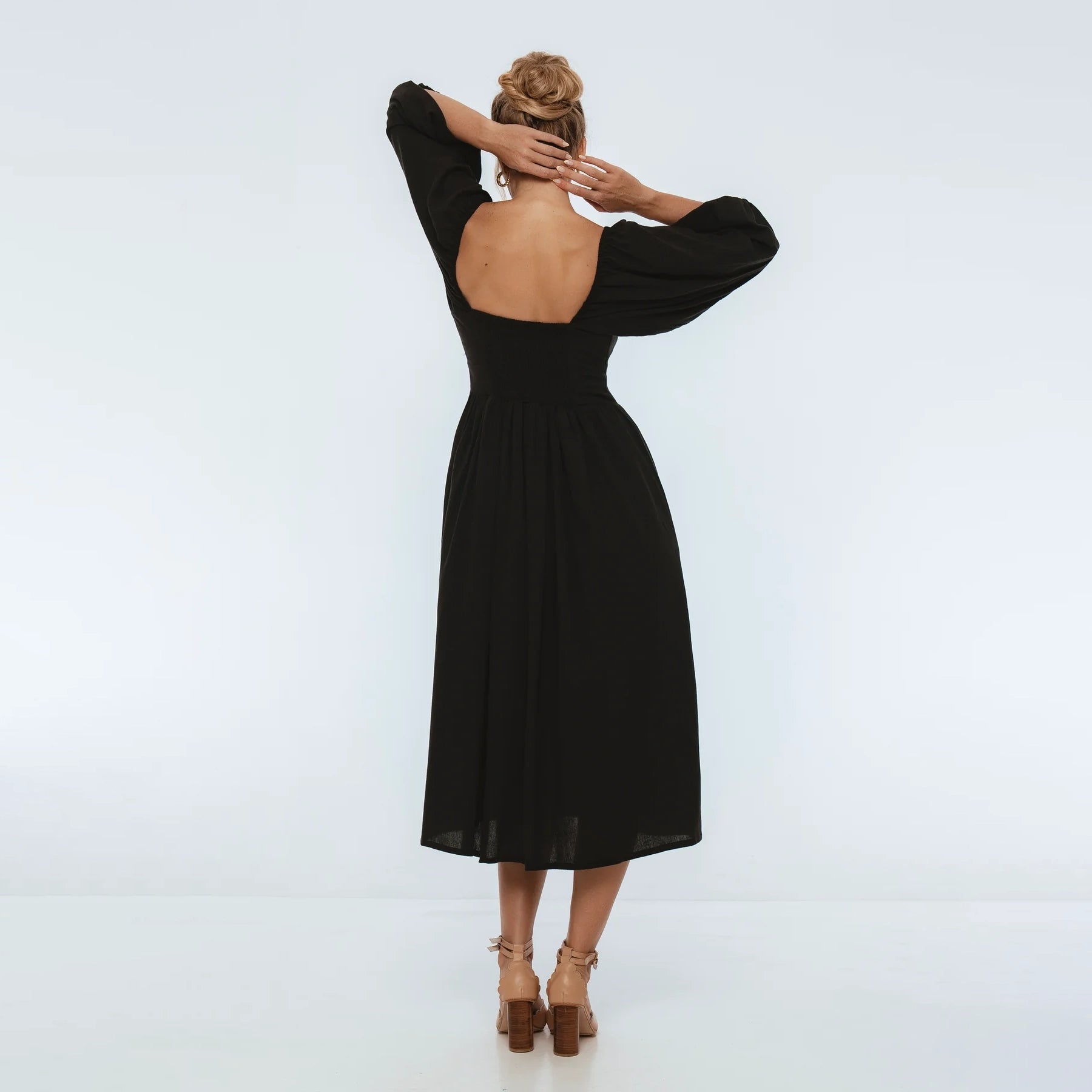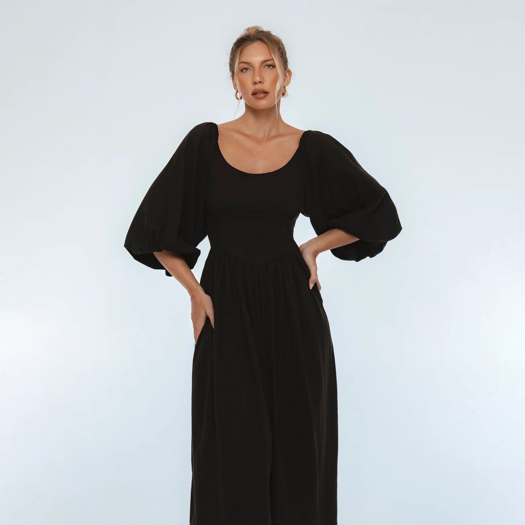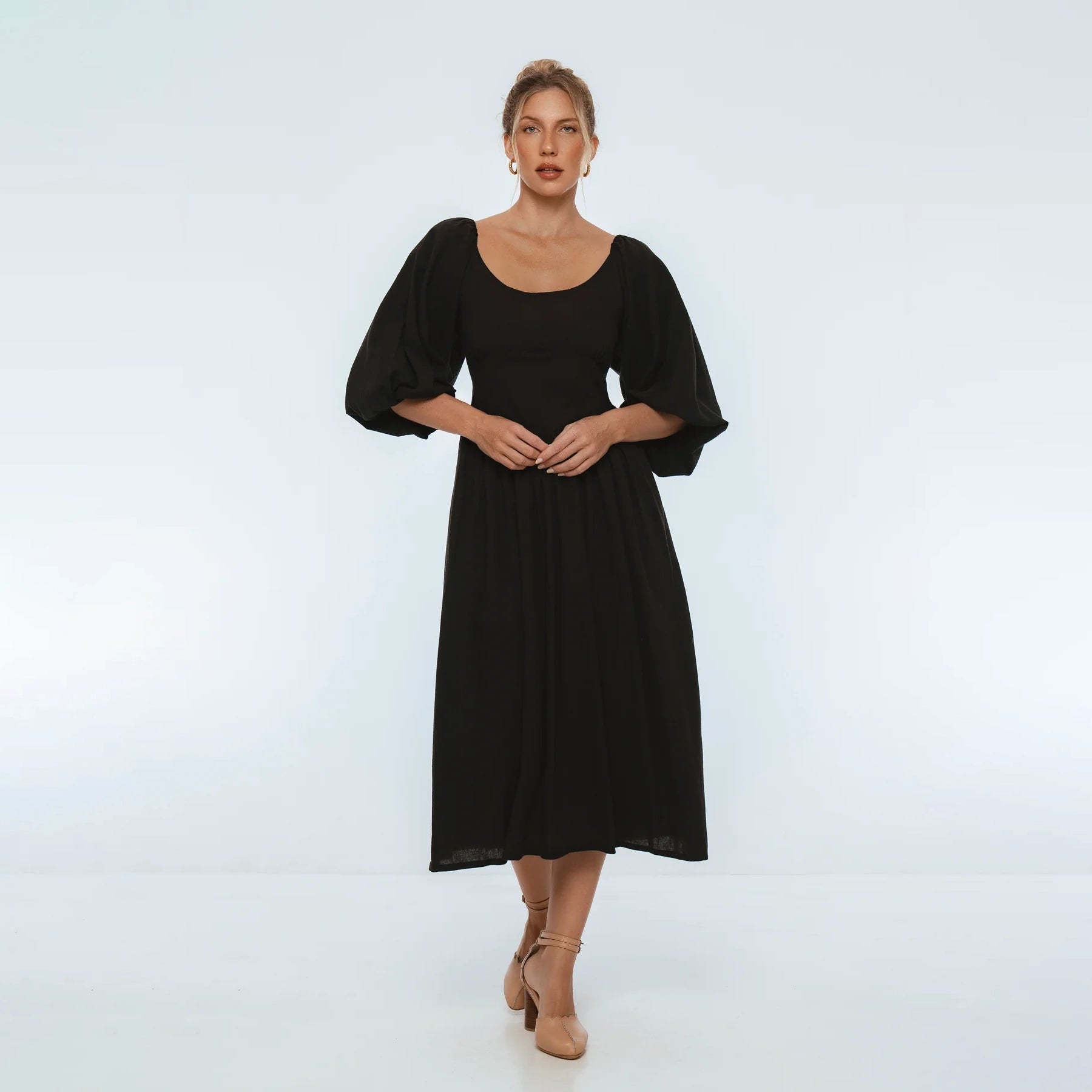 Our effortlessly graceful Genevieve linen dress is designed with a flattering scoop neckline and dramatic puffed sleeves that gather softly at the cuffs. The structured waistline accentuates the figure, while the full, flowing skirt and smocked back panel add comfort and elegance.