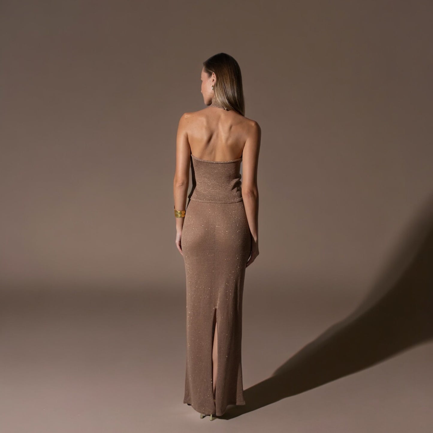 The skirt presents a sleek and elegant design.Its form-fitting silhouette flows down to the floor, creating a seamless and elongated look.Whether paired with its matching halter top or styled with a contrasting blouse, this maxi skirt is a versatile and stylish addition to any evening ensemble, providing a blend of classic grace and modern flair.