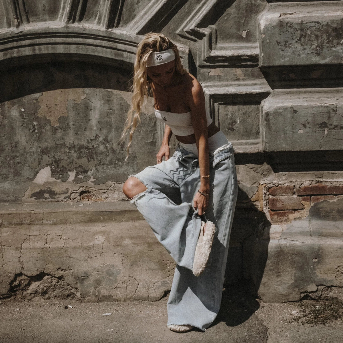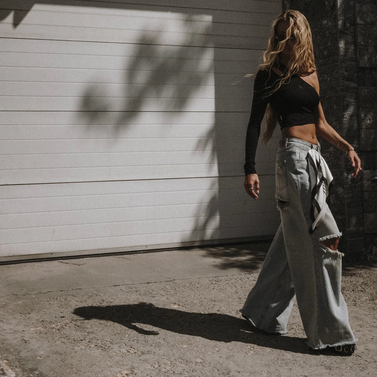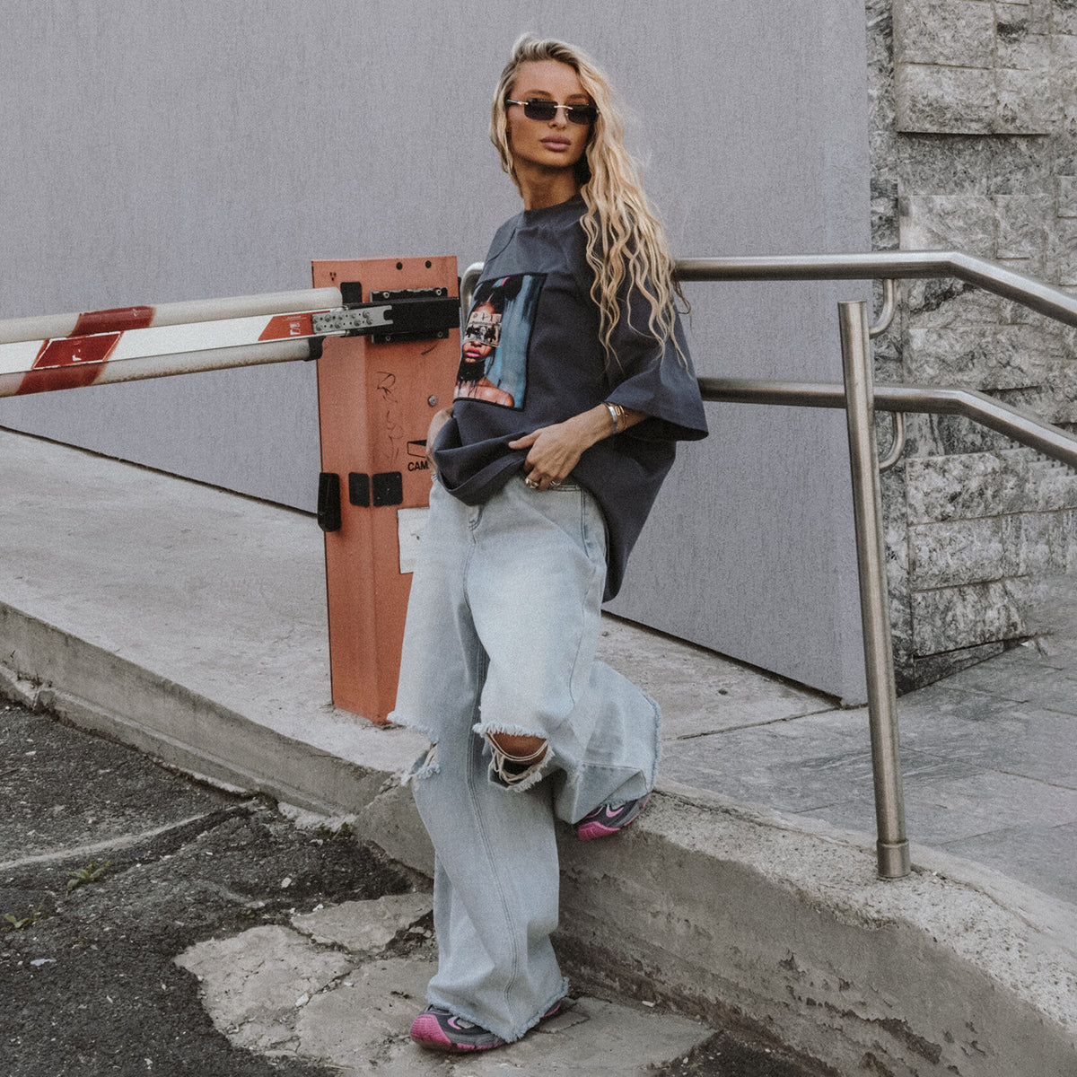 Thick denim holds its shape. Perfectly combined with crop tops, long T-shirts and voluminous hoodies.