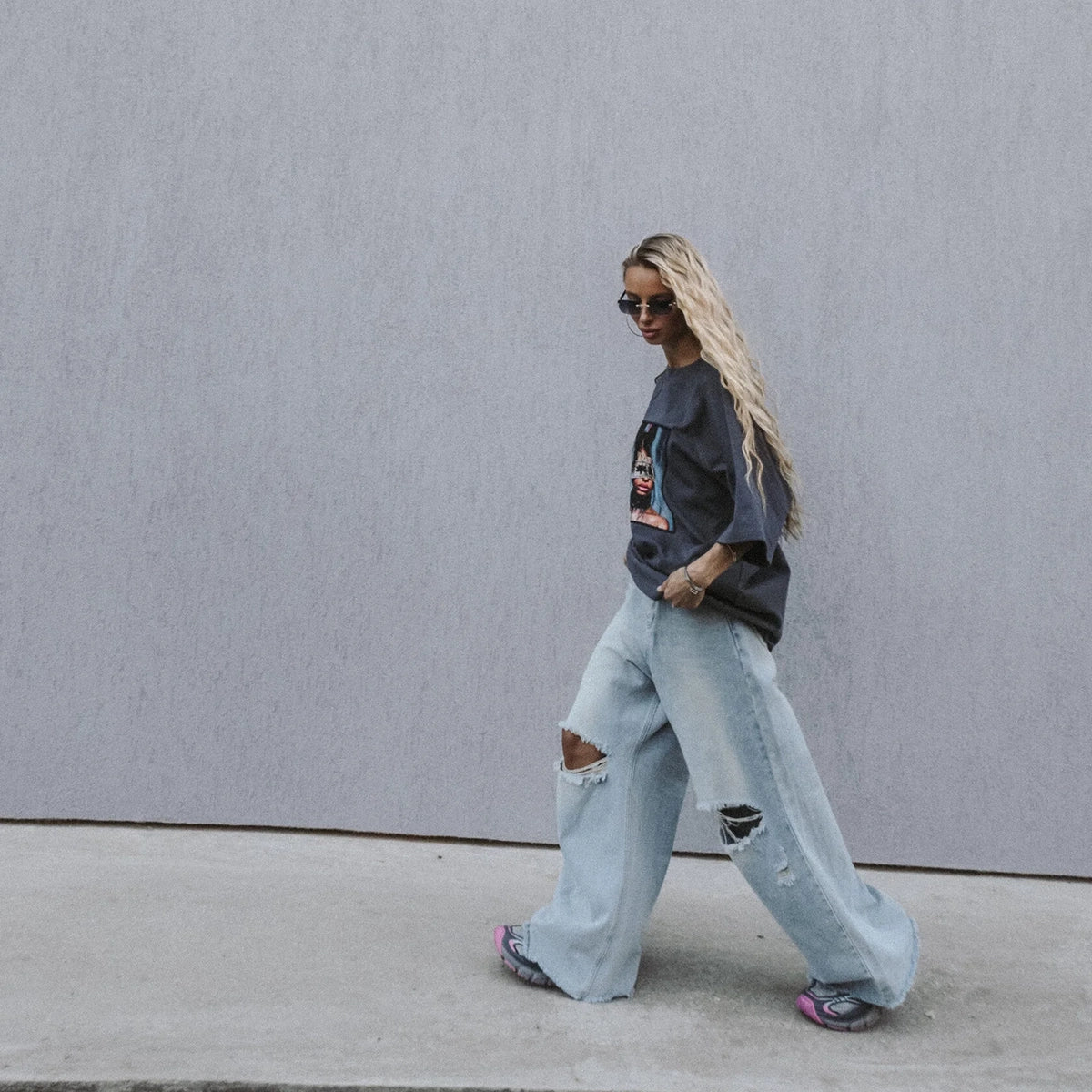Accentuated rips on the knees create a bold and relaxed streetwear look.