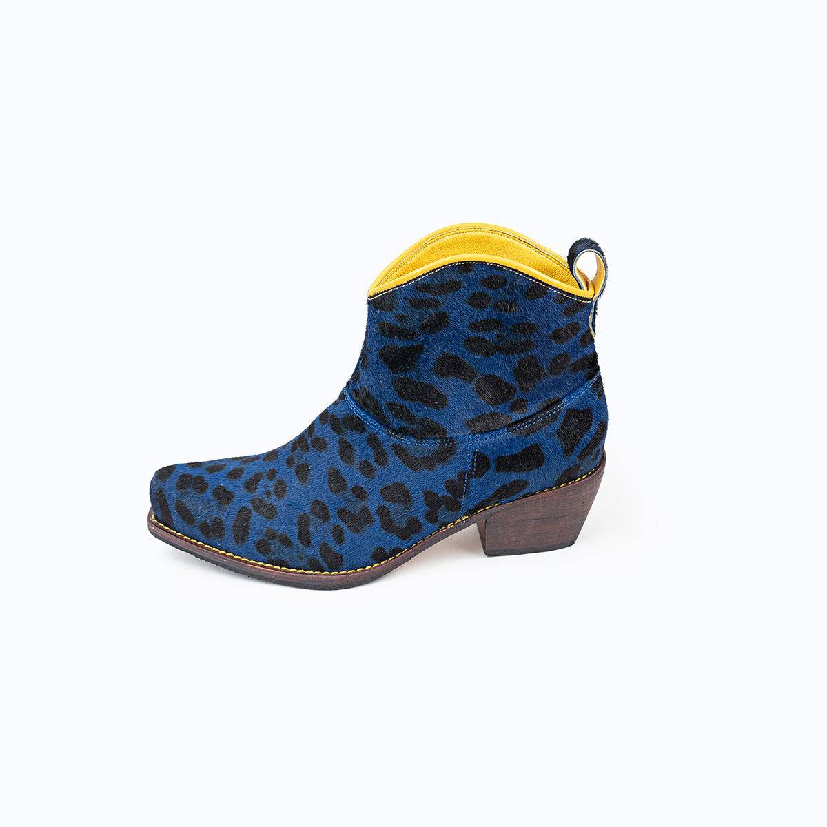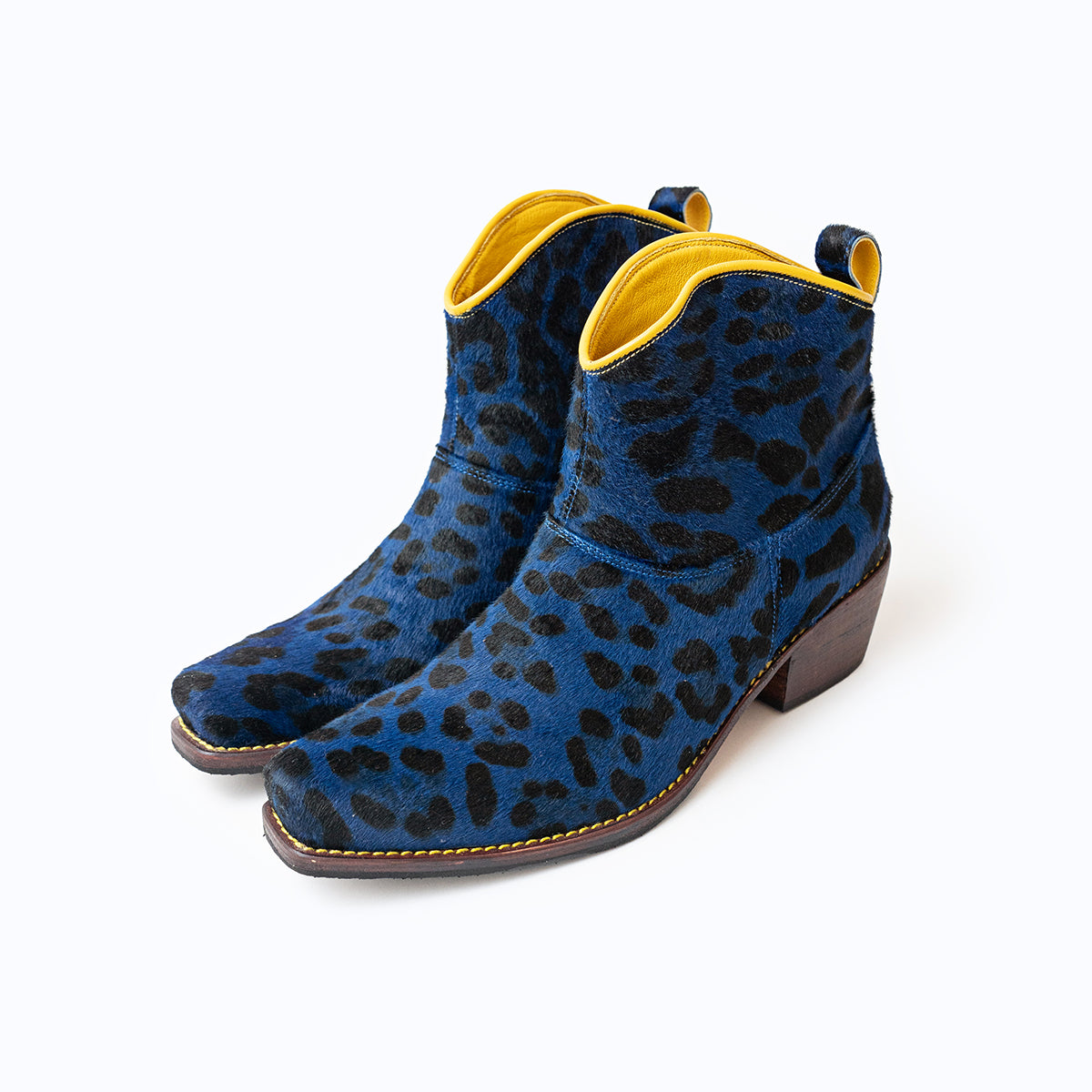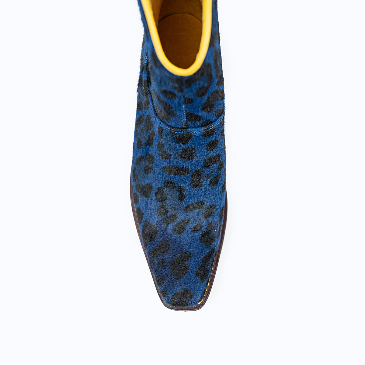 Dark blue ankle boots are a daring blend of style and luxury. They showcase a bold animalistic print crafted from leather with hair-like textures. The striking bright yellow lining adds a vibrant pop of color, creating a captivating contrast that enhances their unique appeal. Step into a world of fearless fashion and let these shoes redefine your style!
