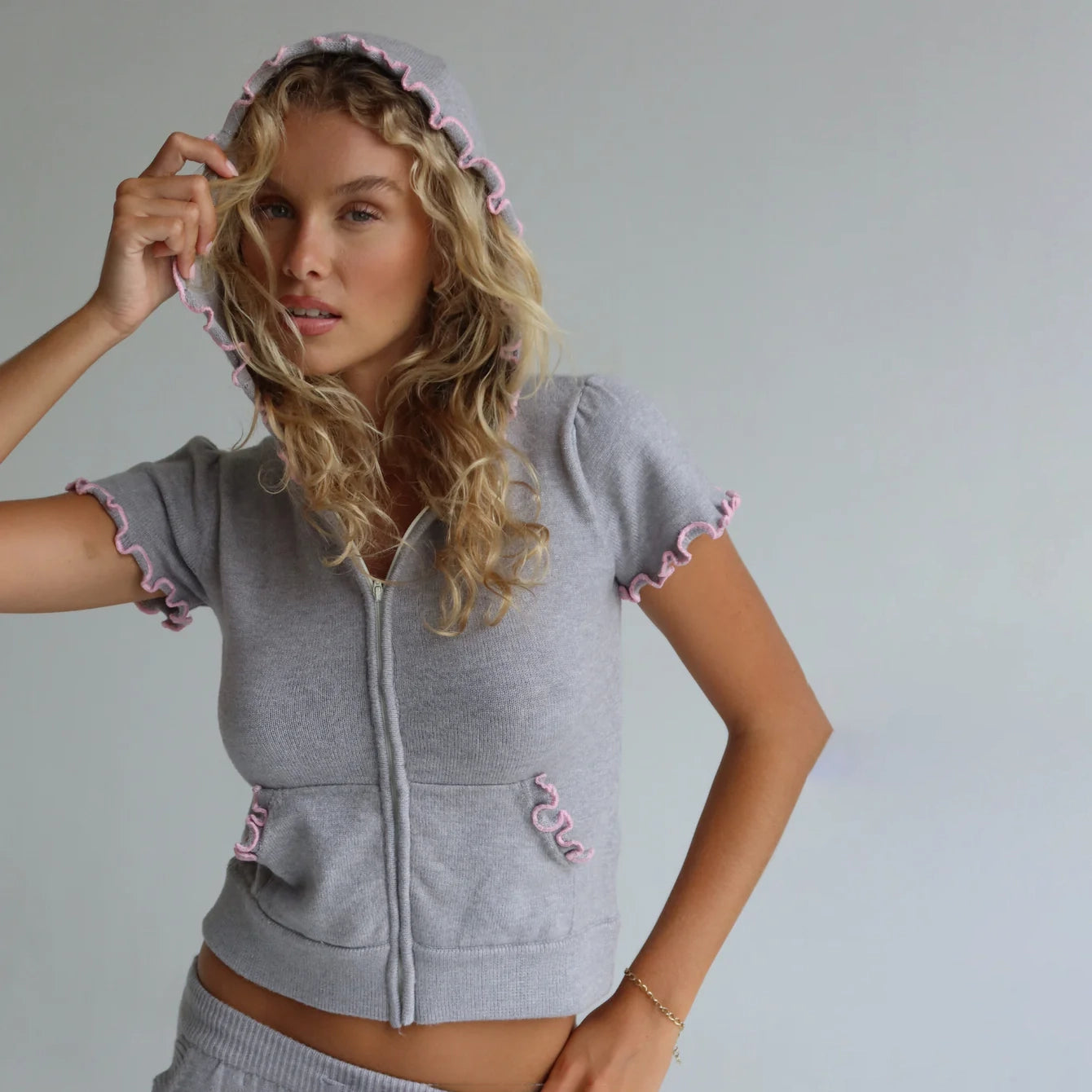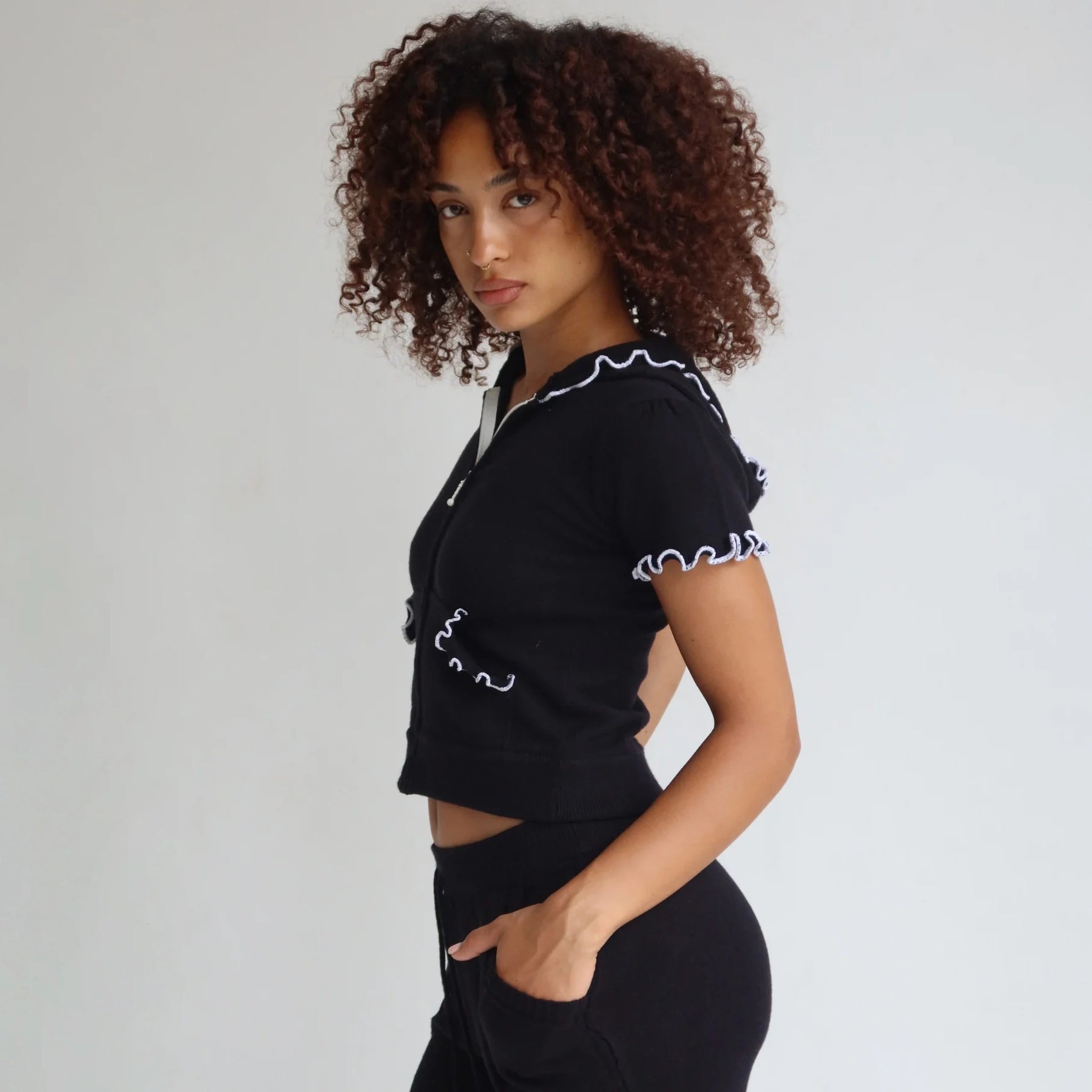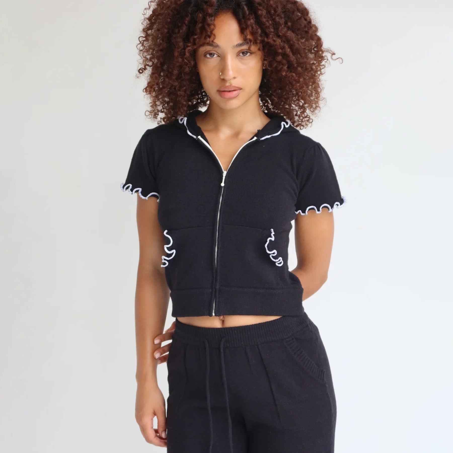 - Short sleeves with delicate ruffled edges
