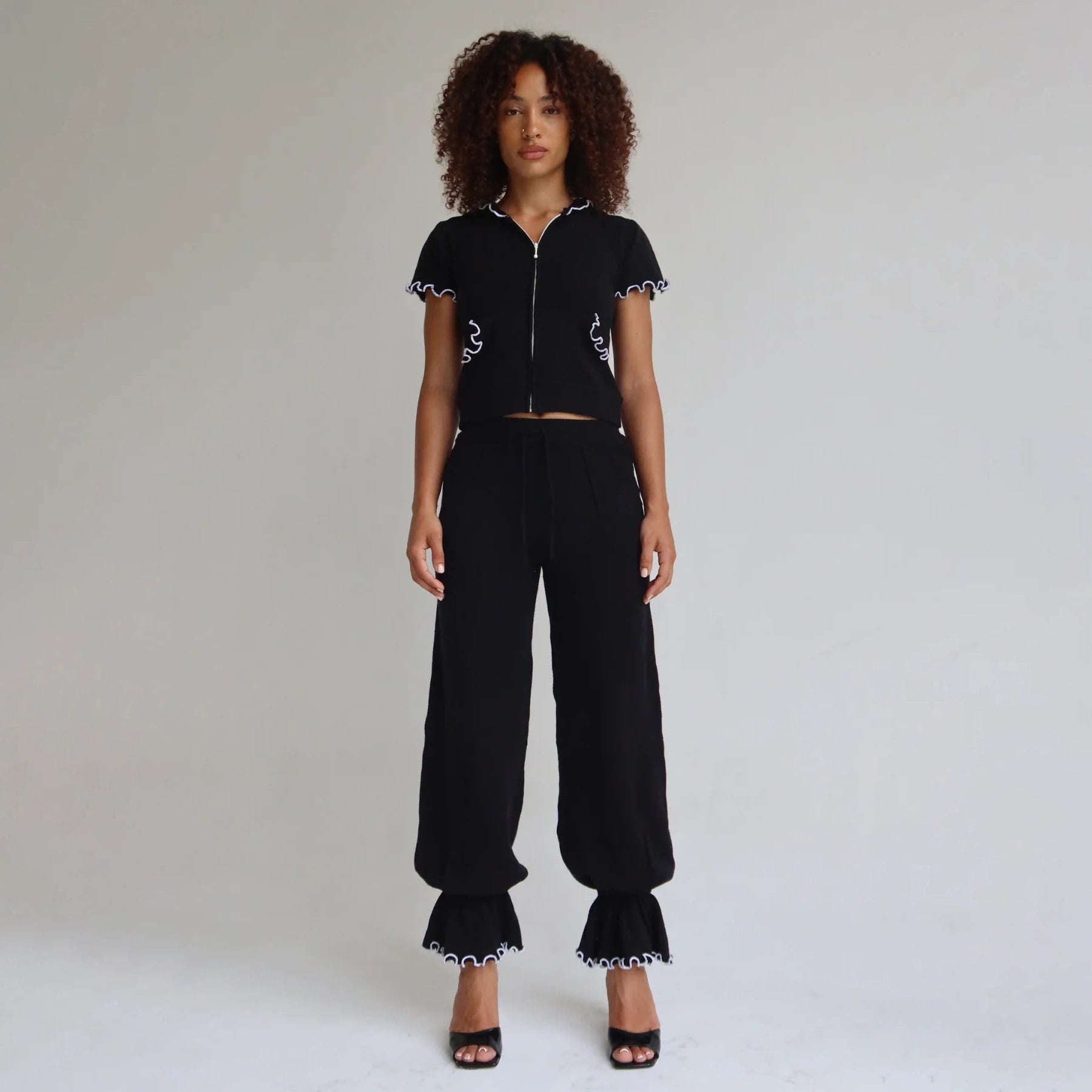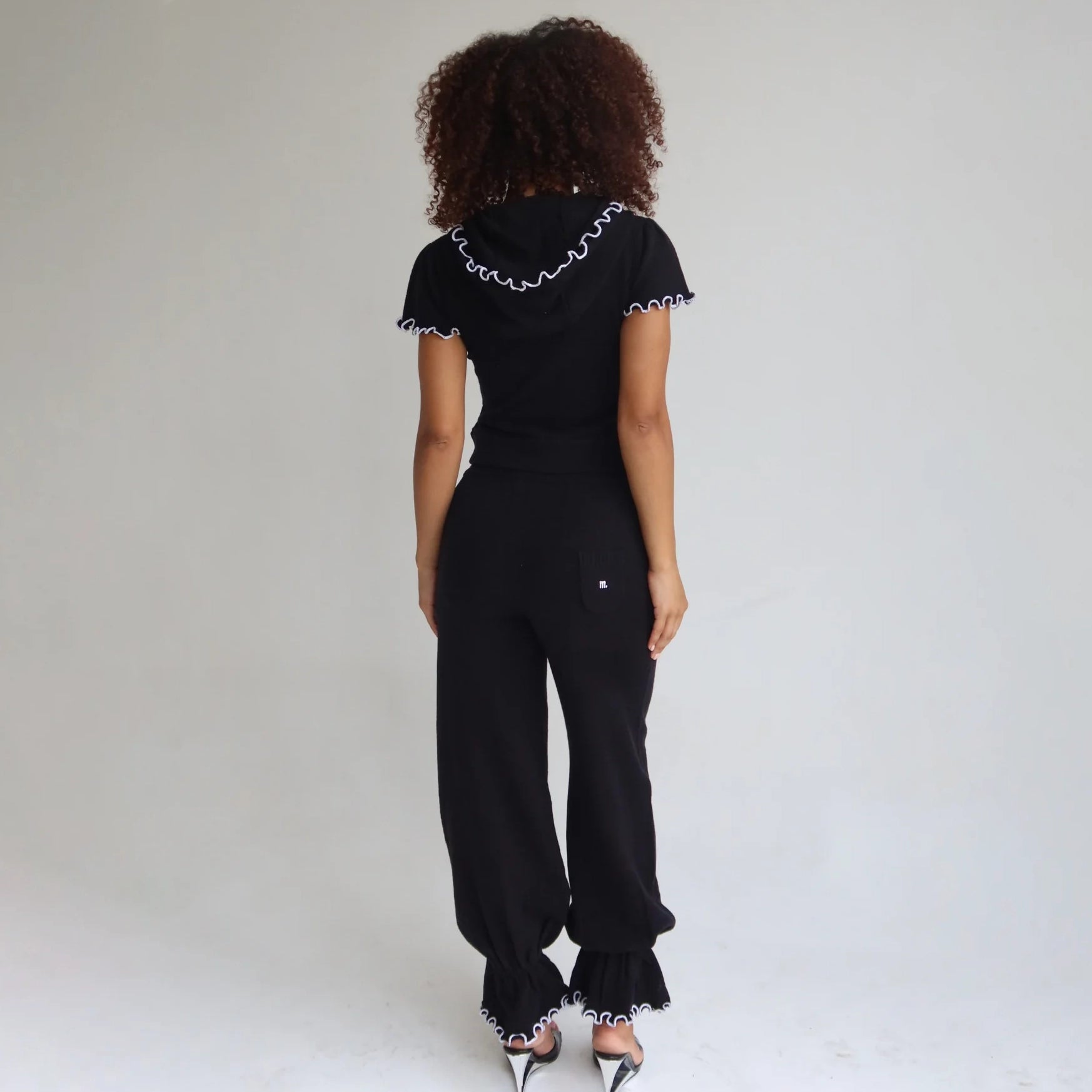 The Layover Knit Pants are part of the perfect cozy travel set, designed for comfort on long flights and easy days on the move. Made from ultra-soft viscose knit, the relaxed silhouette is finished with a playful gathered hem and signature wave-edge ruffle.