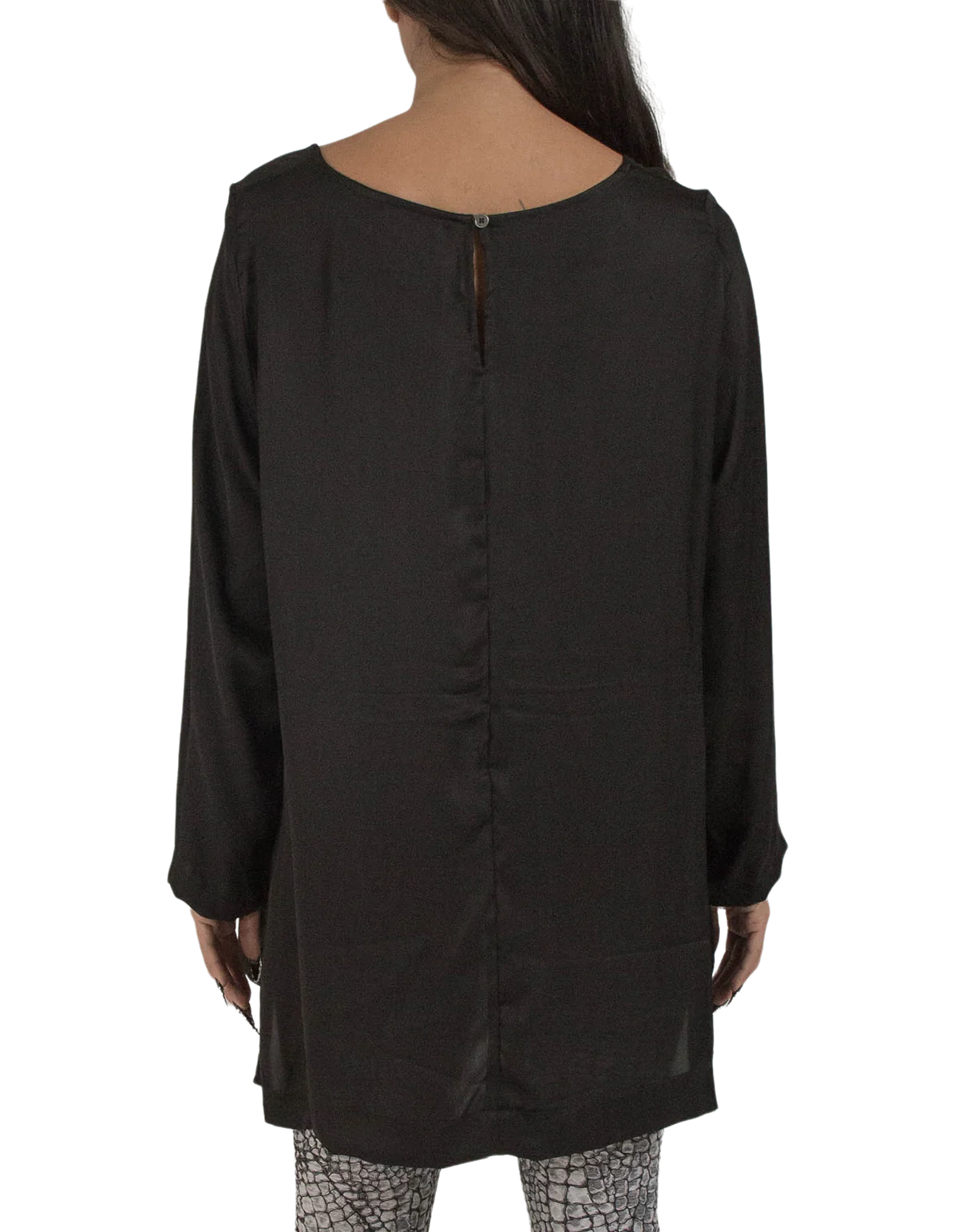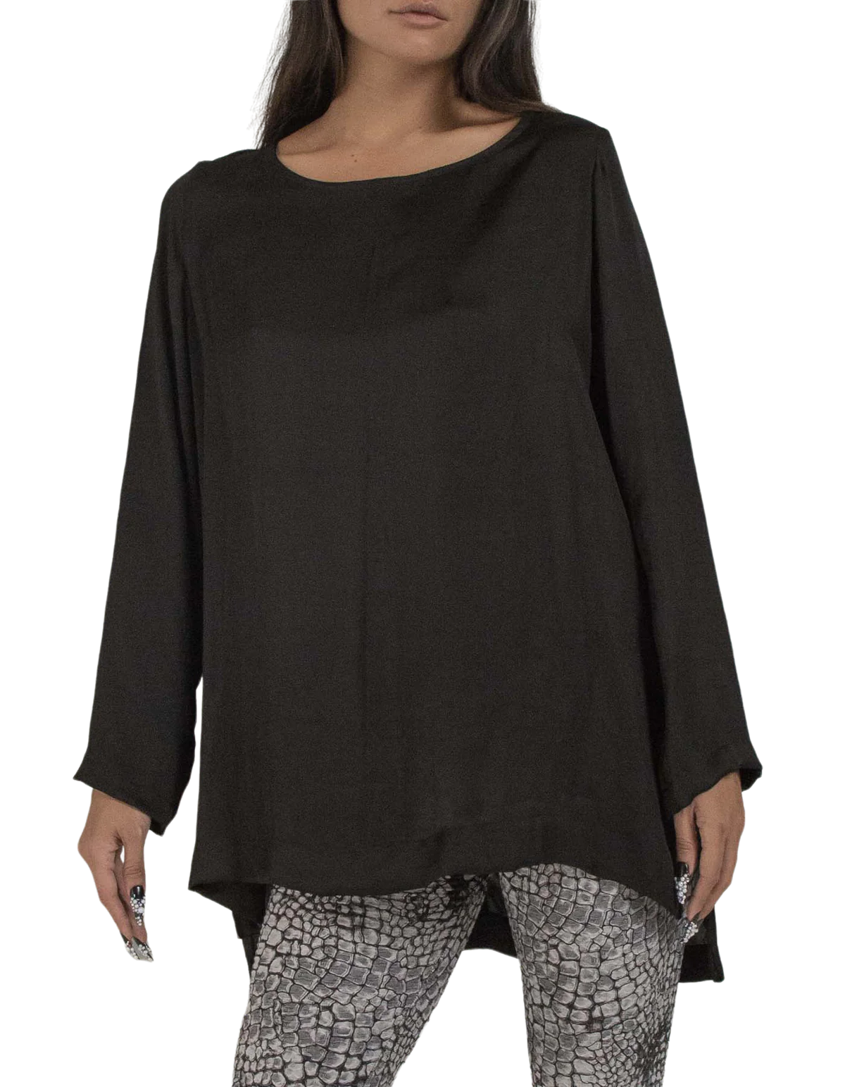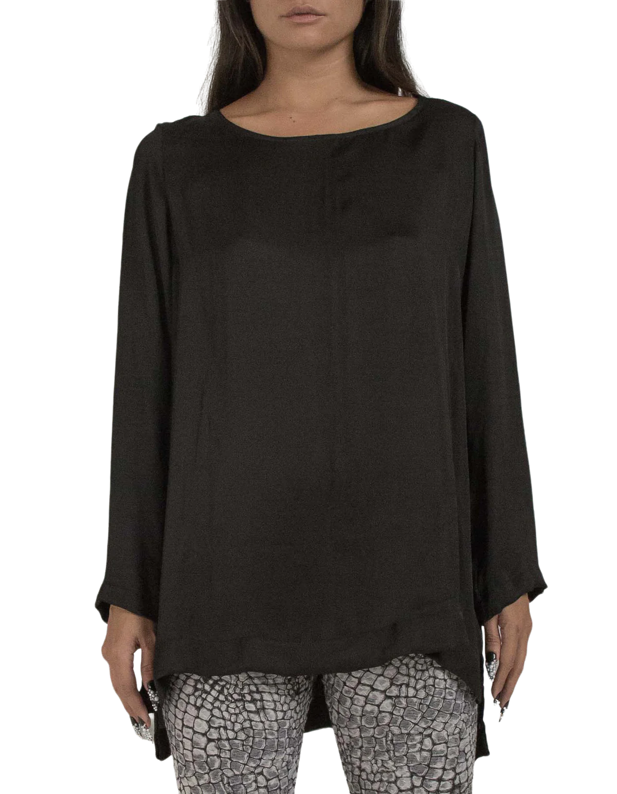 Featuring a wide fit, round neck, long sleeves, black flowy viscose satin, a slit button closure in the back and an asymmetric hem where the back is slightly longer than the front.