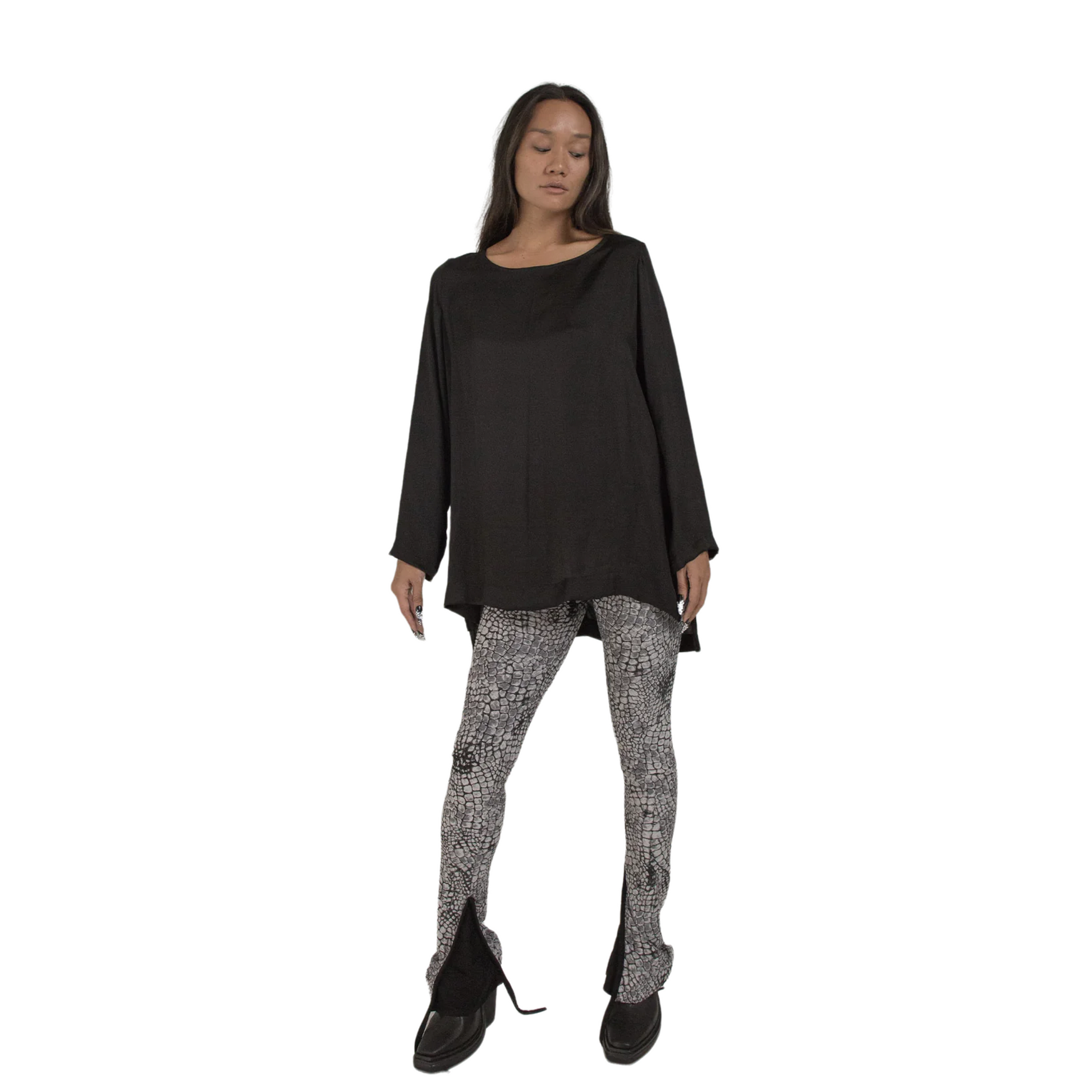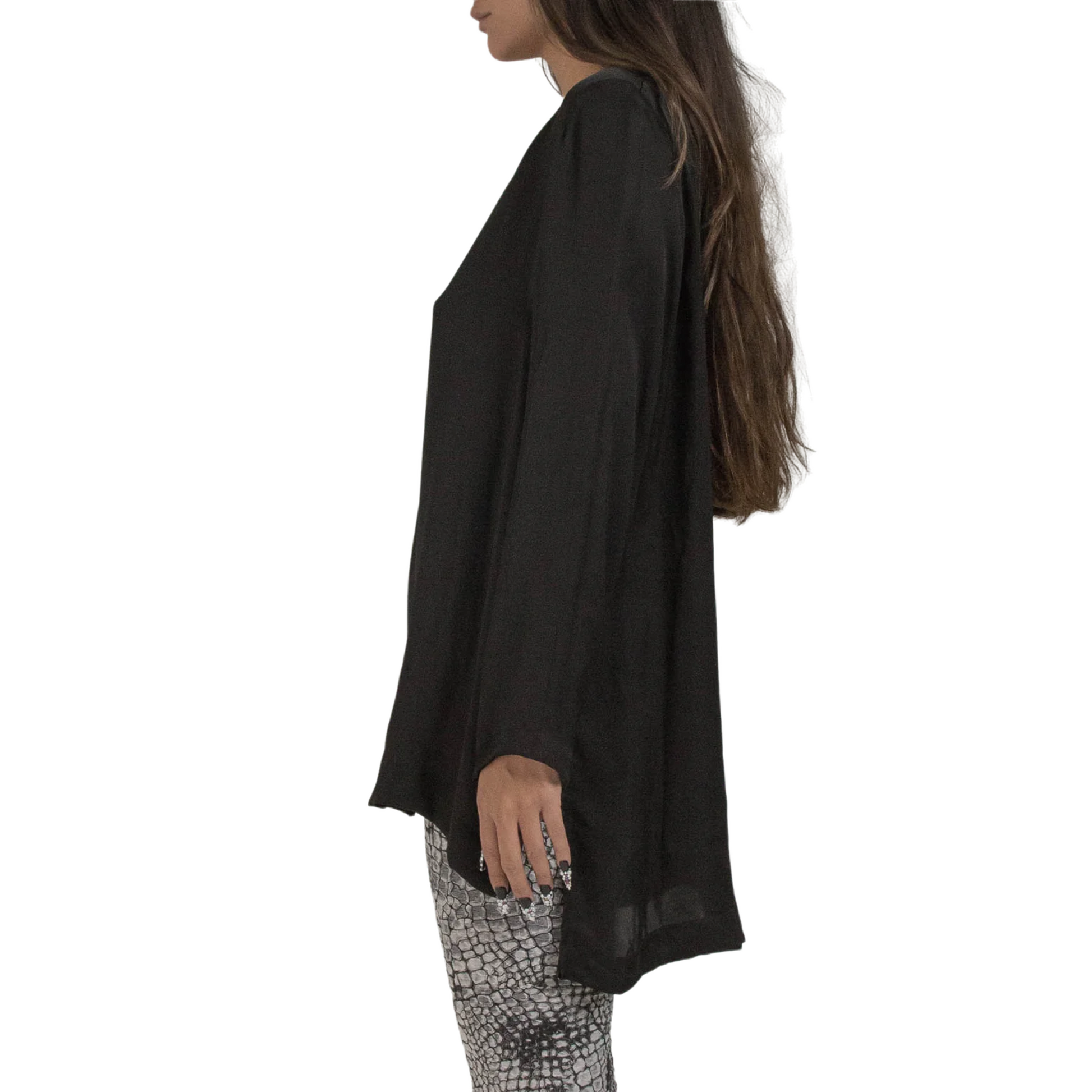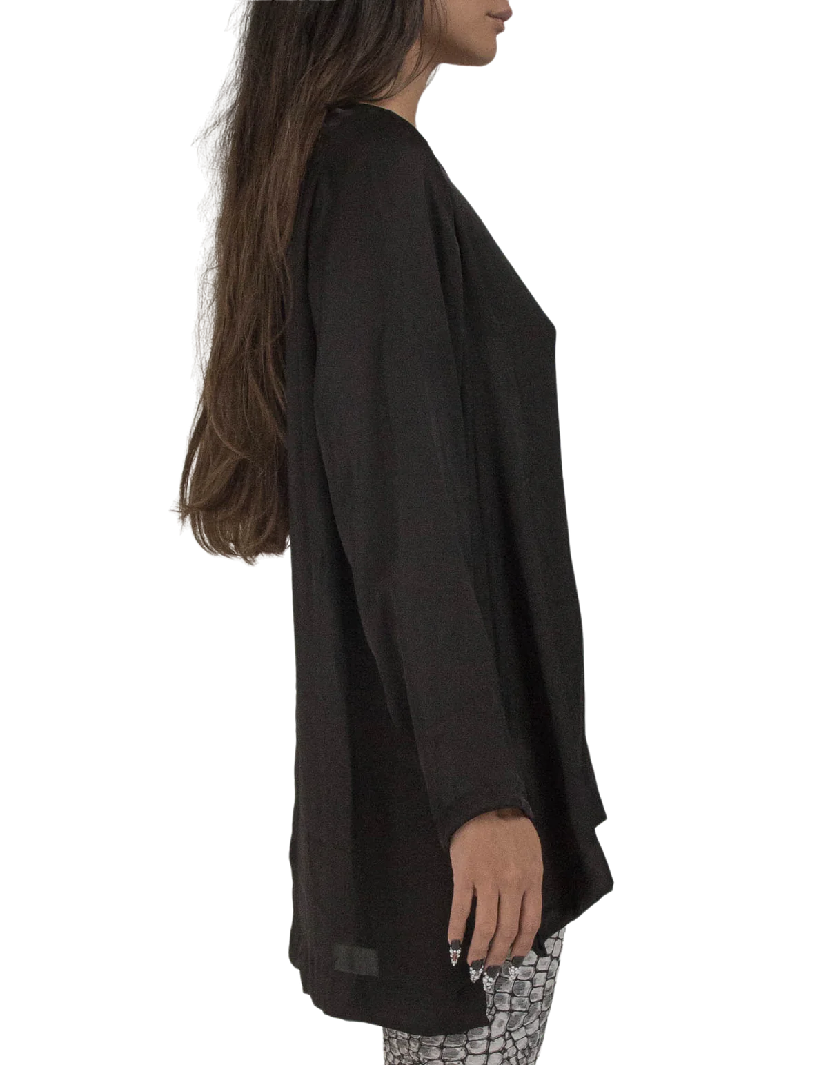 Featuring a wide fit, round neck, long sleeves, black flowy viscose satin, a slit button closure in the back and an asymmetric hem where the back is slightly longer than the front.