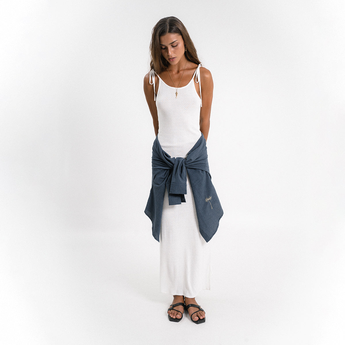New jacquard-knit fabric is made from fabric blended with linen fiber - it has a silky sheen and an open construction that lends itself perfectly to wearing on vacation. This dress is designed for a body-hugging fit with adjustable straps so you can get the neckline just right.