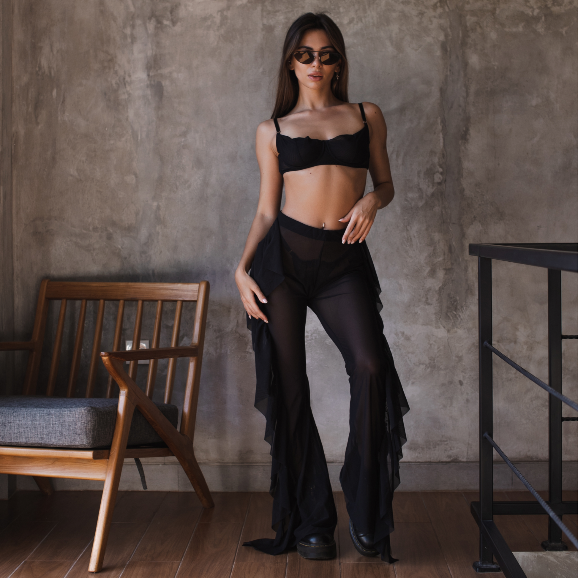 Stunning Mesh Pants, transparent pants expertly crafted from durable, high-quality material. Featuring exquisite fabric ruffles along the sides, these pants are the epitome of style and sophistication. Perfect for parties, photo shoots, beach outings, dinners, and even daytime wear, they are guaranteed to make you shine wherever you go. Designed to accentuate your figure in the most flattering way, these pants exude confidence and sensuality, ensuring you stand out with every step.