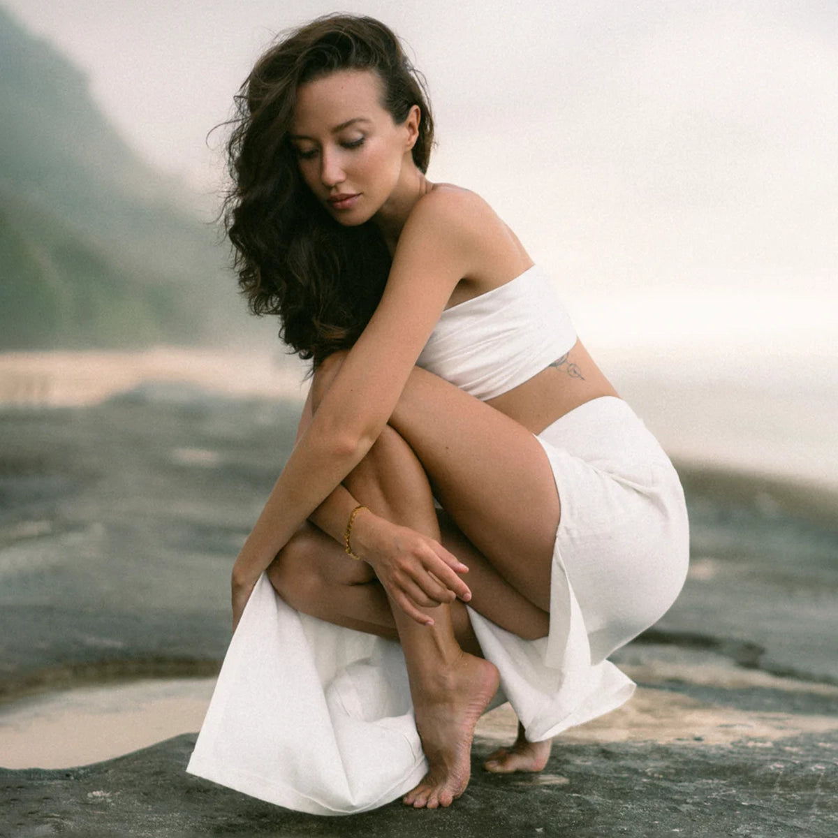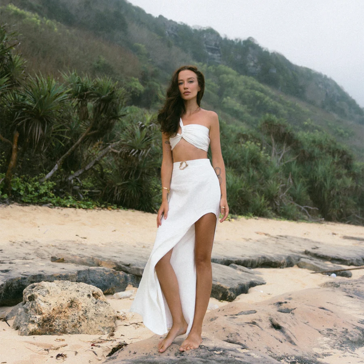 Handcrafted 100% linen skirt with an elegant high slit and asymmetrical design. Lightweight and breathable for effortless wear. Features a versatile wrap-style fit for comfort and elegance.