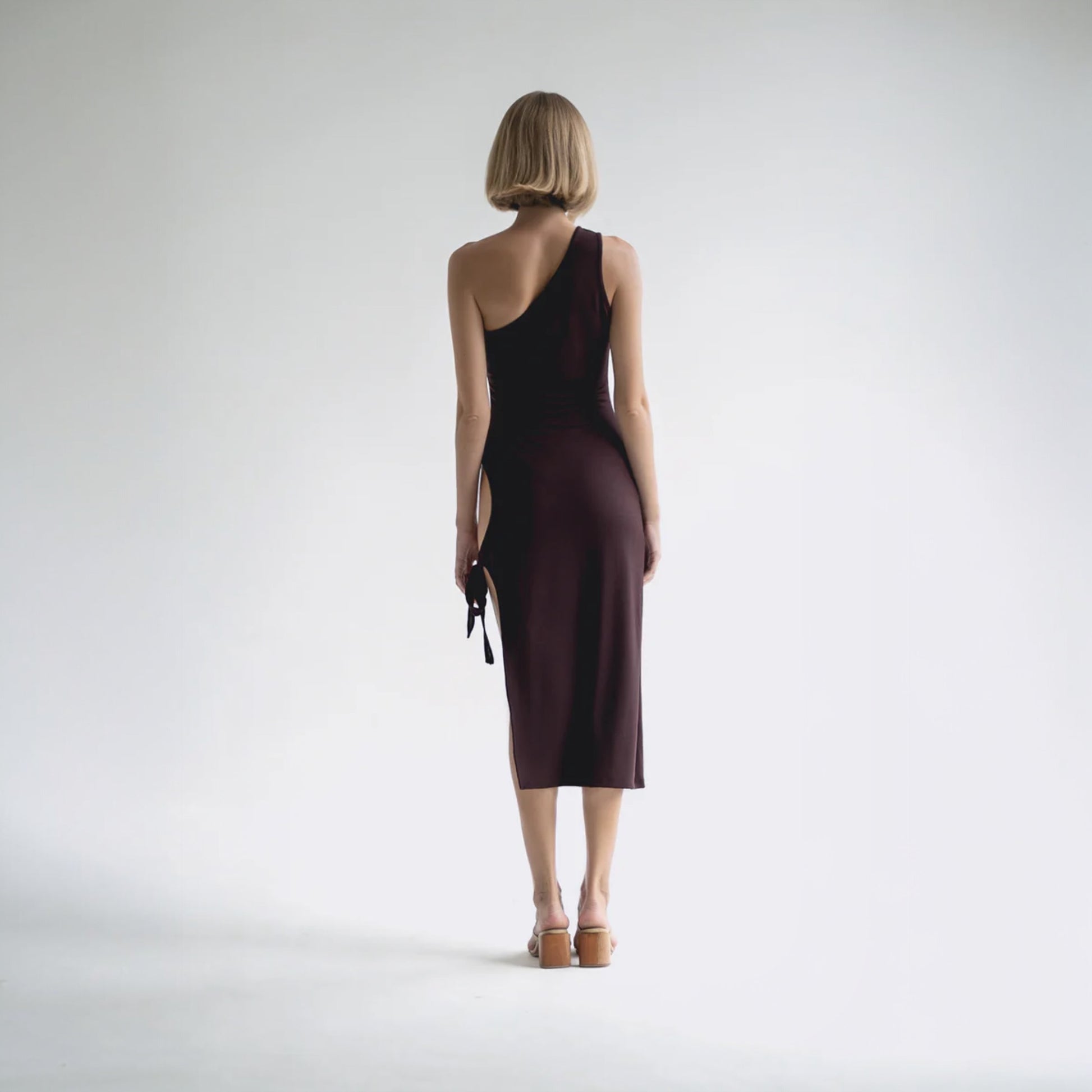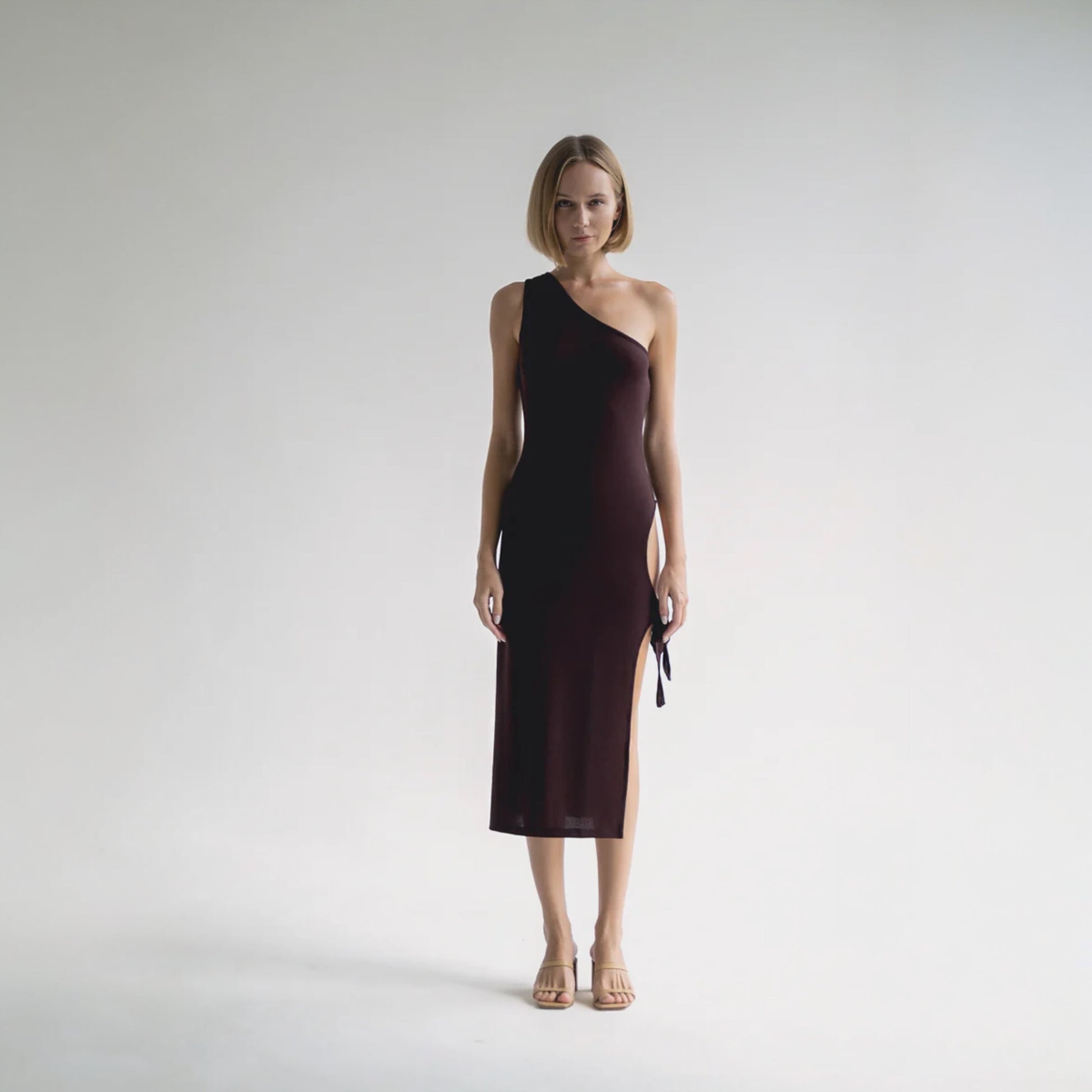 Slip into the captivating embrace of the Nina Dress by Matahari the Label, rendered in a sumptuous rich chocolate color. Meticulously designed to highlight the curves and contours of your figure, this dress is a fusion of bold sensuality and refined sophistication.