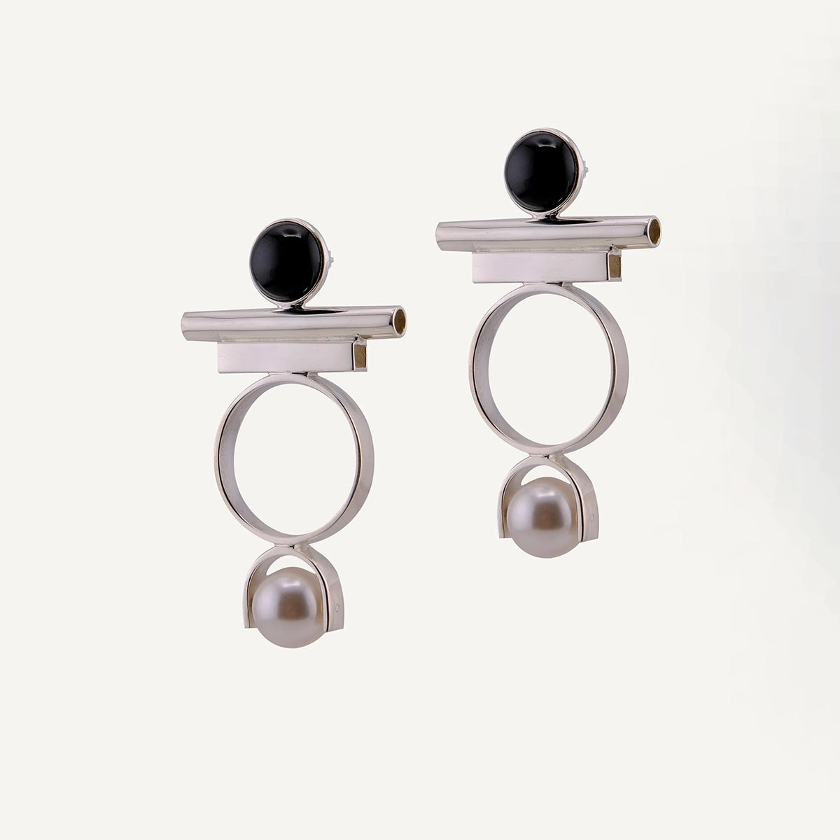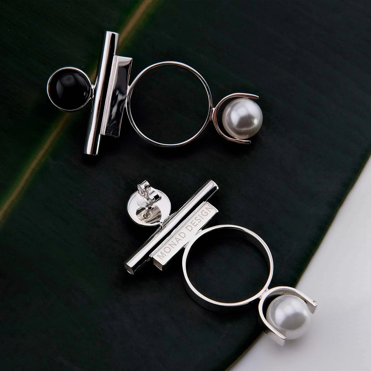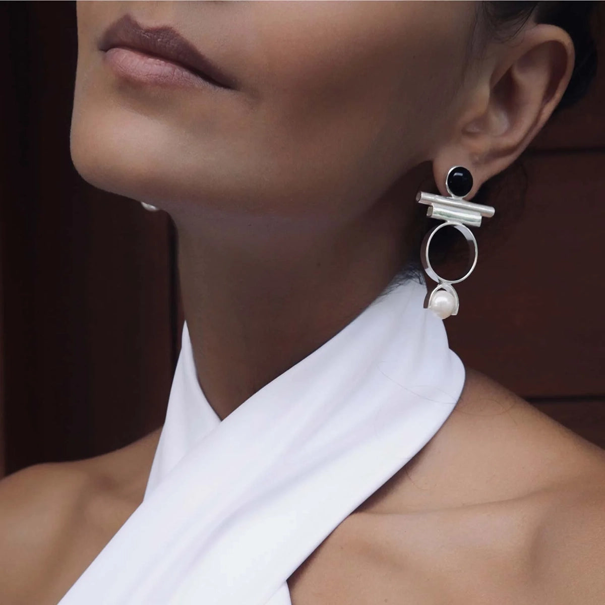 Elegant Statement 925 Sterling Silver Earrings with Black Onyx Cabochon and Shell Pearls. Completely Handmade in Bali.