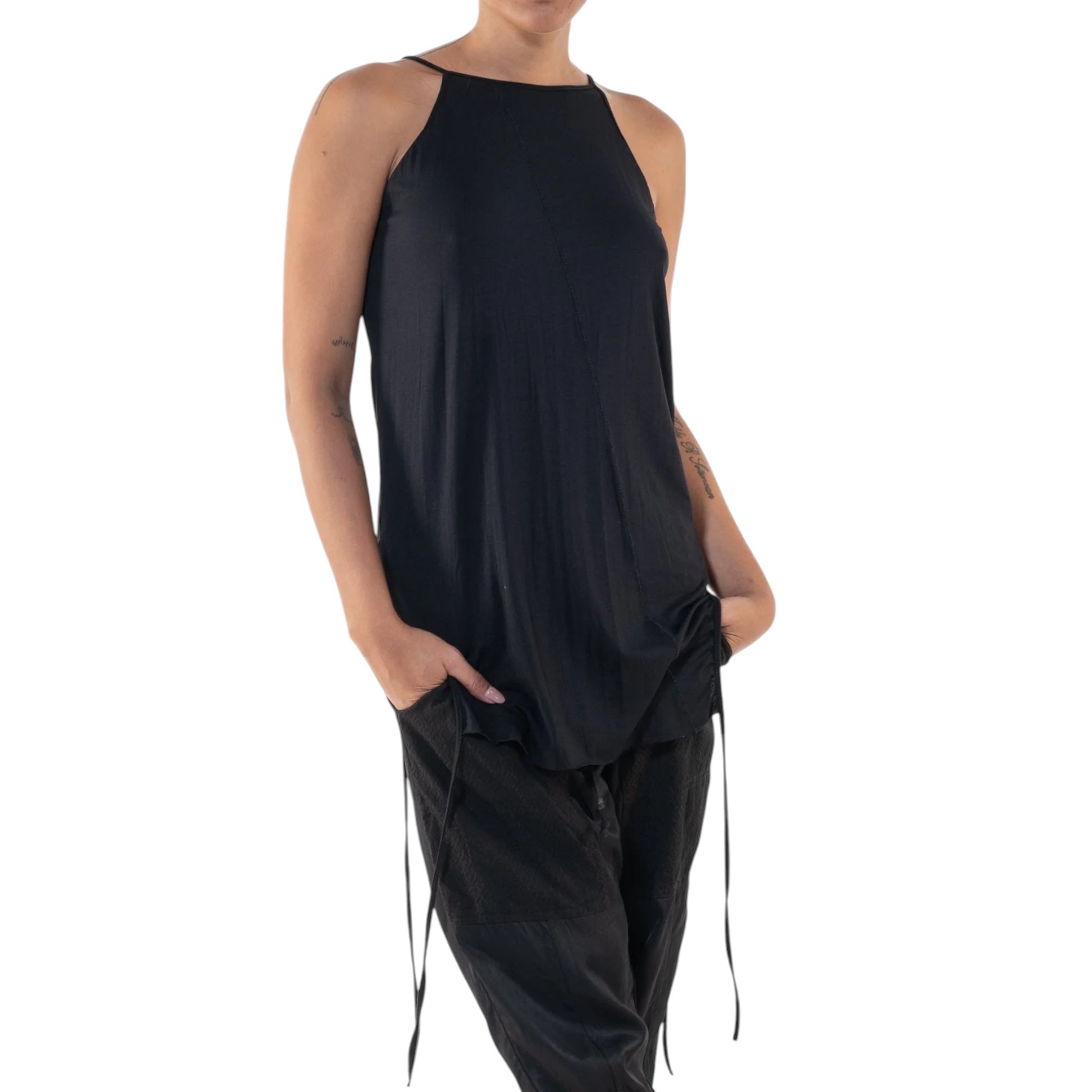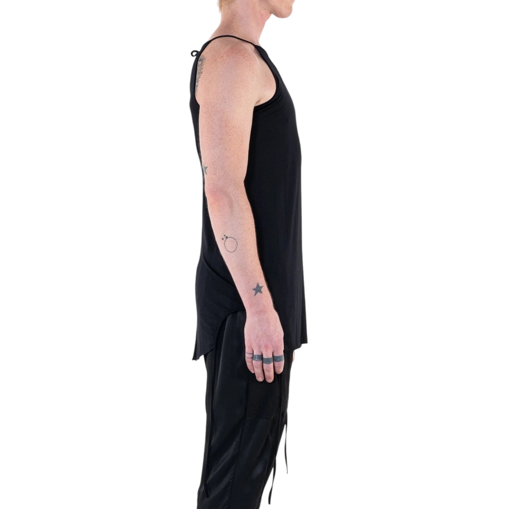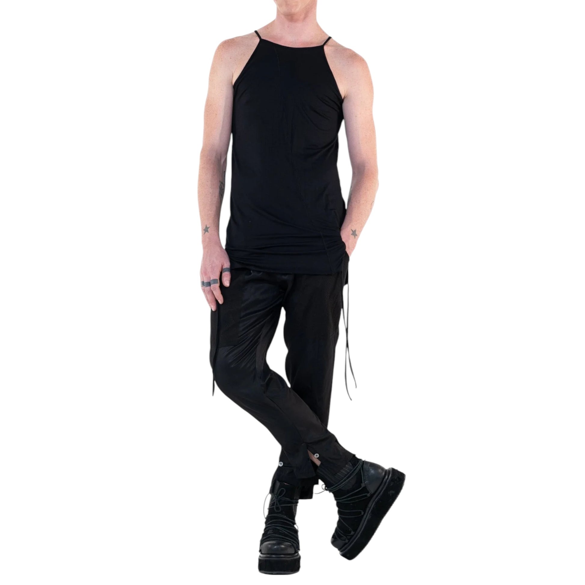 The Oracle Tank Top stands out with its innovative asymmetrical hems adorned with decorative bias strings, adding dynamic flair to its silhouette. Each detail is thoughtfully designed to elevate your style, whether you're hitting the streets or stepping into the spotlight.