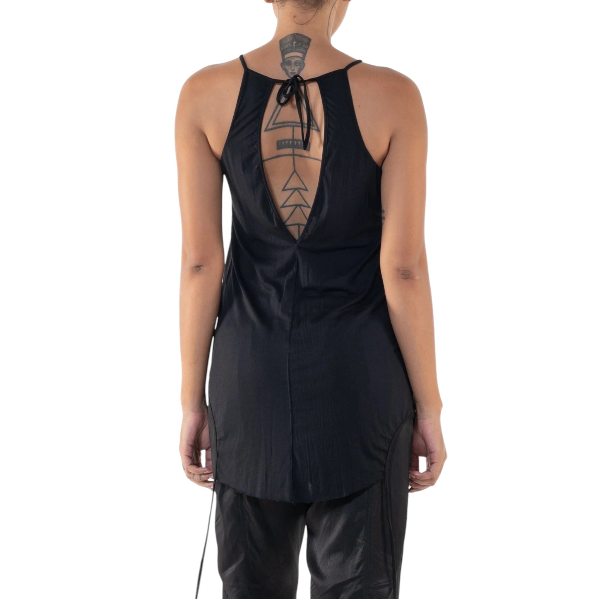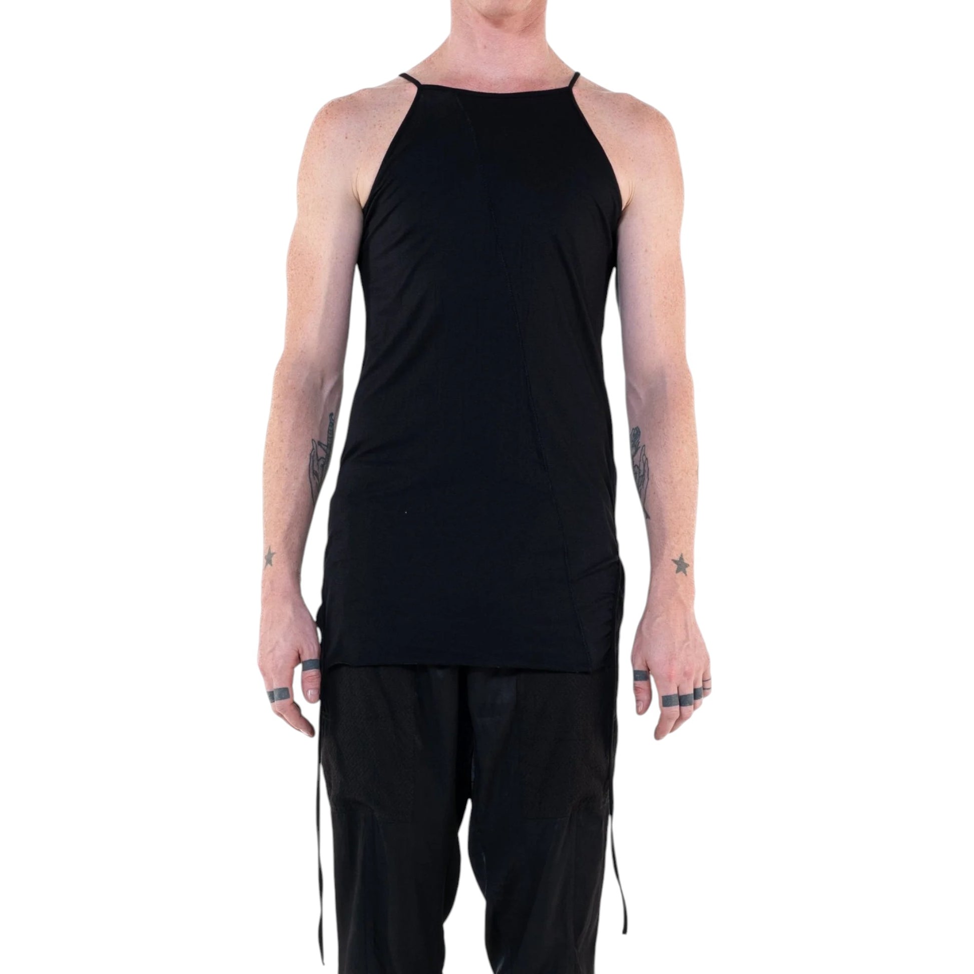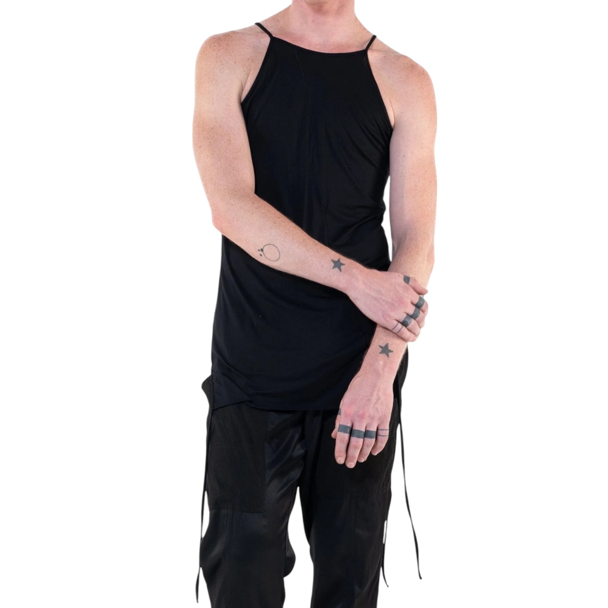 Introducing the Oracle Tank Top—an avant-garde masterpiece that transcends conventional fashion boundaries, redefining modern style with its sleek design and meticulous craftsmanship. Crafted from premium black fabric, this unisex tank top features a slim halter neckline and a daringly deep back, exuding confidence and sophistication.