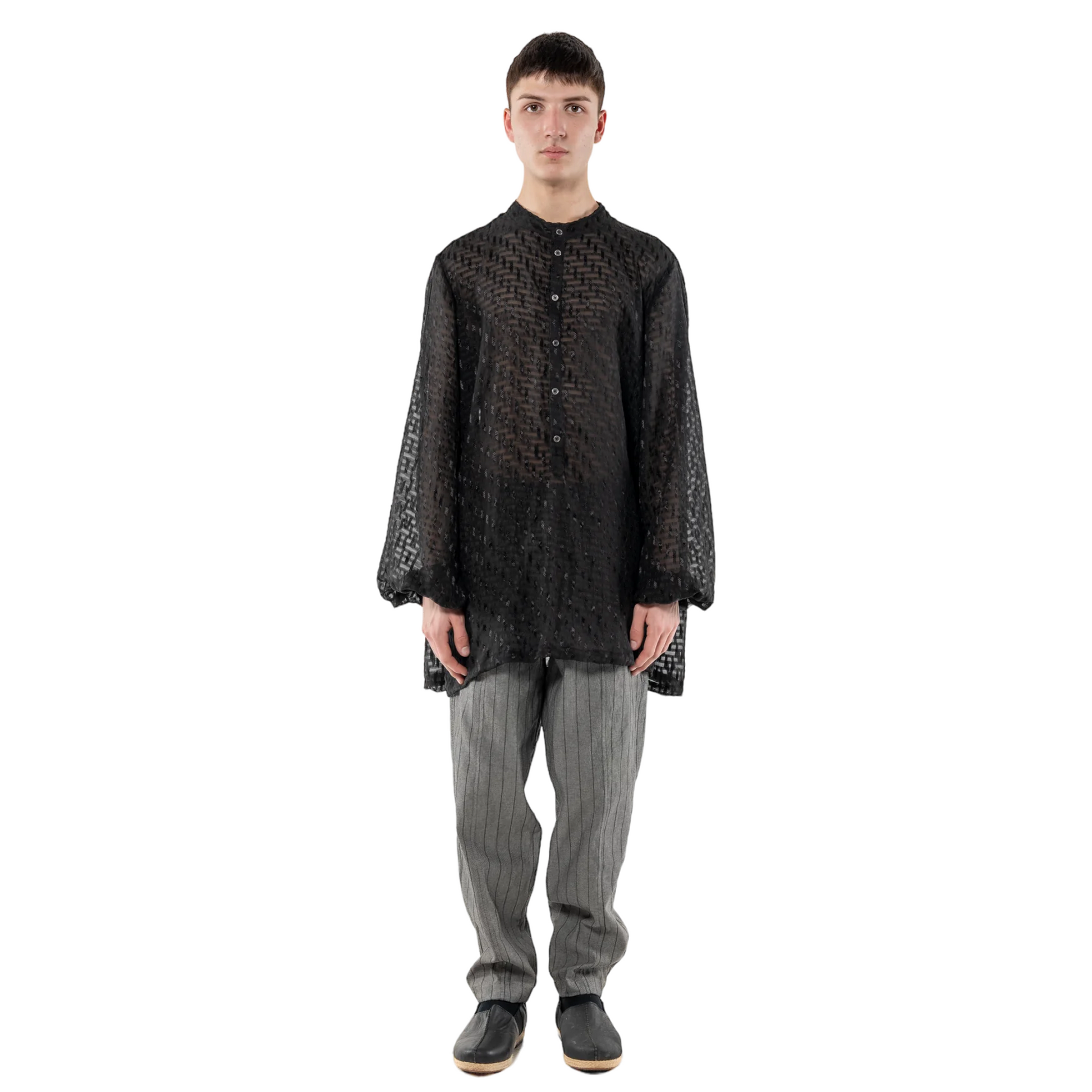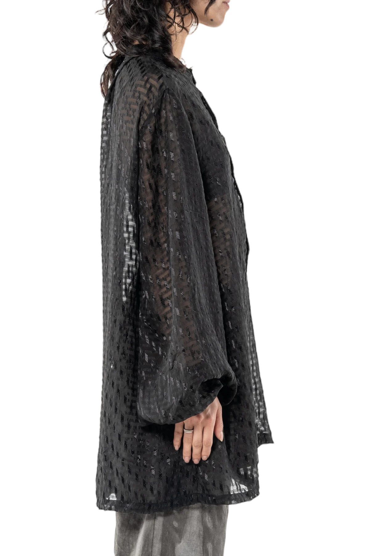 Introducing the Unisex Pakk Silk Blouse—an avant-garde masterpiece of dark fashion. This gender-fluid piece showcases a jacquard geometric fabric with satin effects, embodying uniqueness. With wide puffed sleeves, half way button panel and an oversize body, it welcomes diverse body shapes. The cuff buttons, back pleats, and slight asymmetric hem add depth and romance. Redefine your style with this daring and inclusive statement piece.