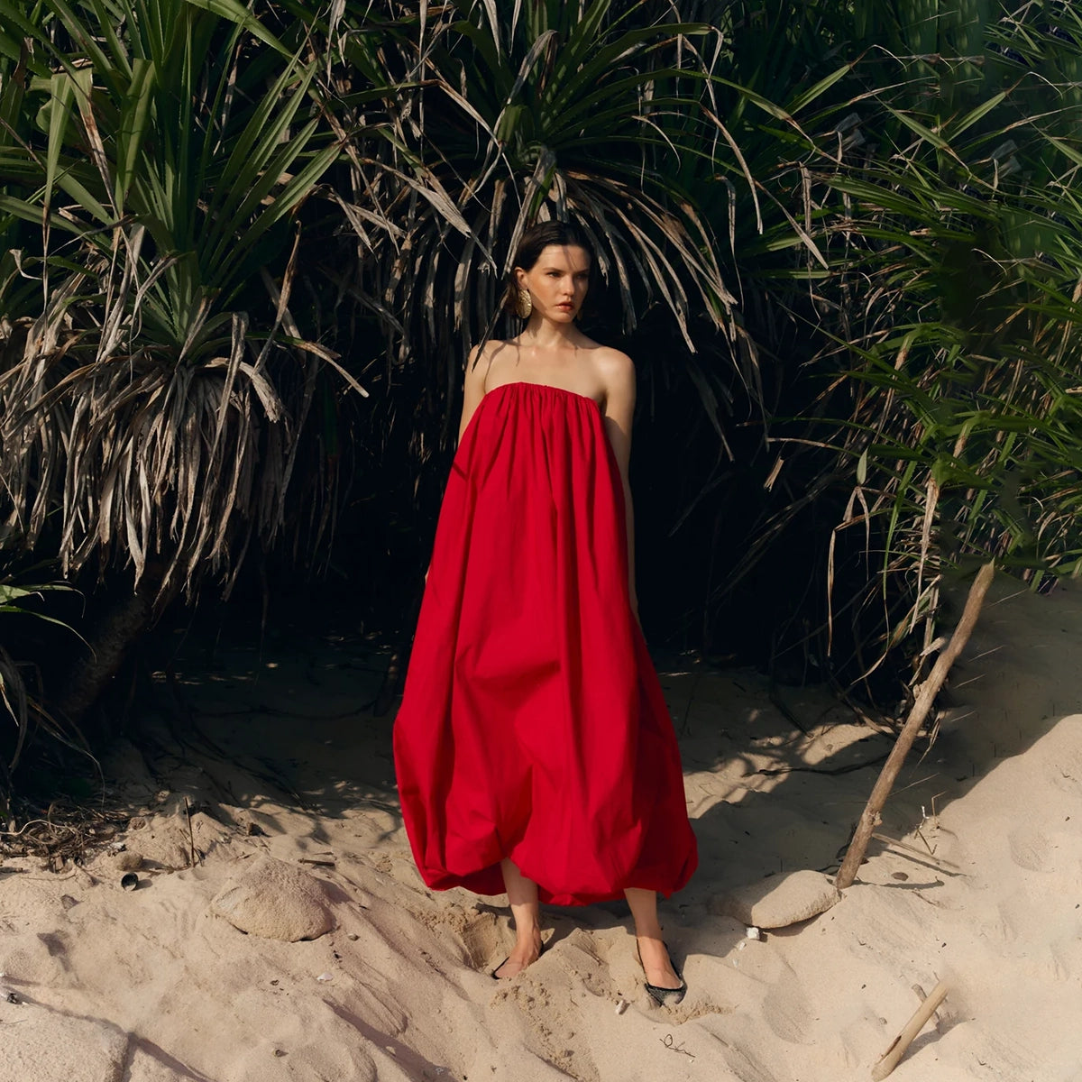 The Balloon Strapless Dress is made from lightweight and breathable height quality luxuries cotton , this dress combines effortless elegance with a voluminous silhouette. The elasticized neckline ensures a secure fit while adding a touch of relaxed sophistication to the strapless design. And for an extra touch of functionality, the Kira Dress features hidden side pockets, making it as practical as it is stylish. Perfect for day-to-night versatility, the Kira Strapless Dress comes in a range of bold, classic shades, including black, red, beige, and blue. Whether you pair it with sleek heels for an elevated look or dress it down with sneakers for casual chic, this dress will have you turning heads wherever you go.