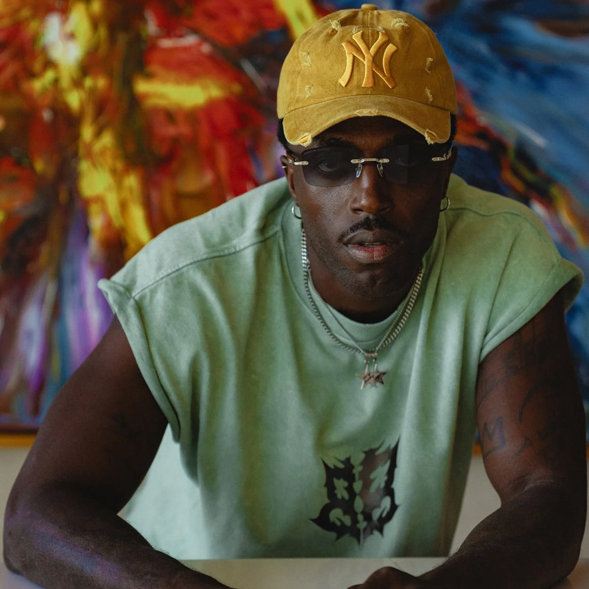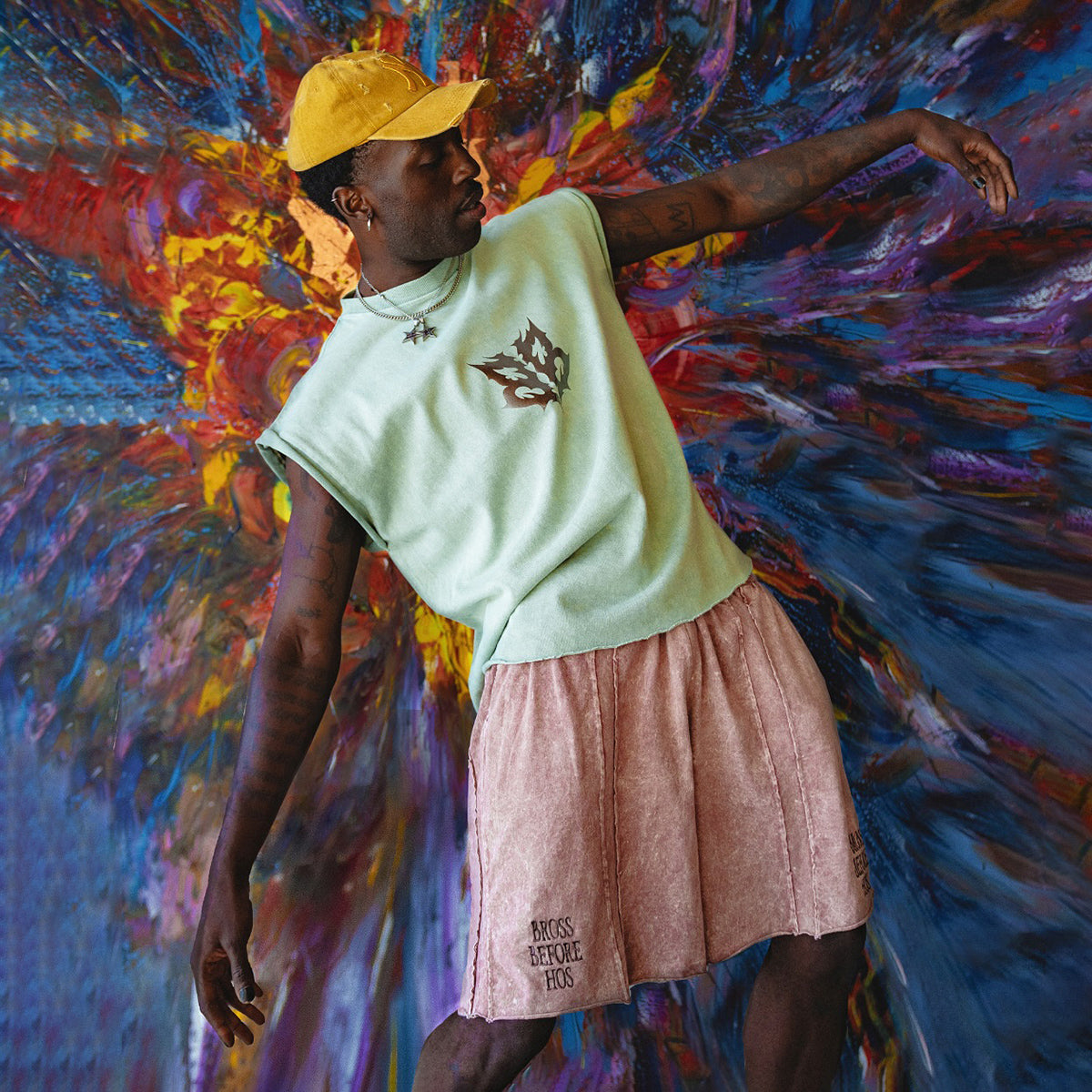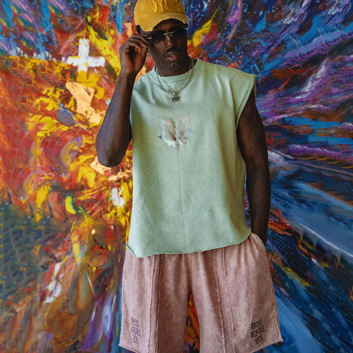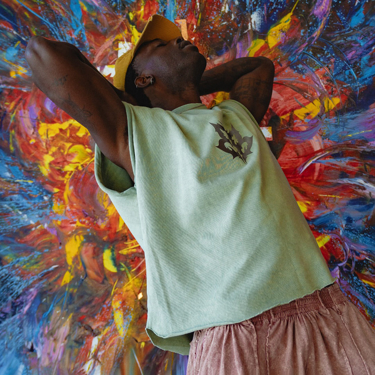Muscle in a soft shade, crafted with a stonewash finish for added softness and a subtle faded effect. The straight cut with raw edges and a glossy chest print create a relaxed yet stylish look.