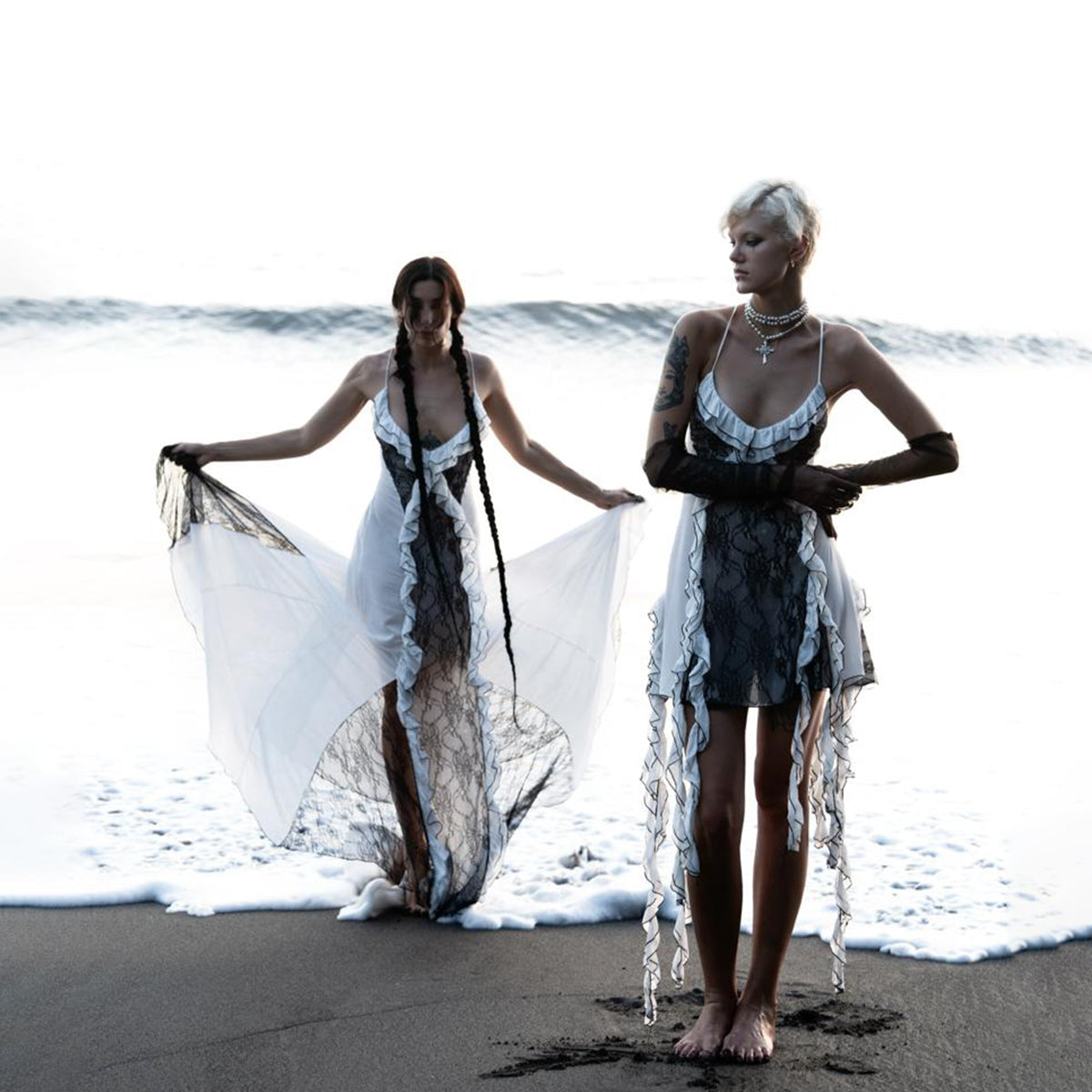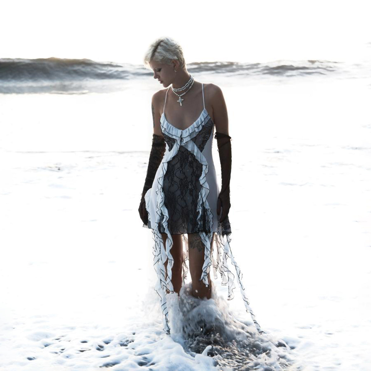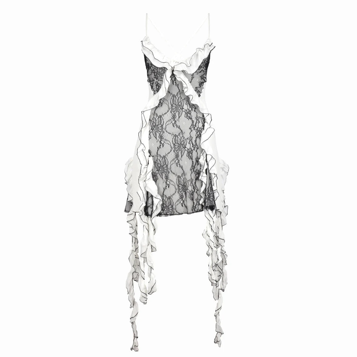 The short dress is made of viscose crepe and Chantilly lace. The dress is decorated with ruffles and lacing on the back.