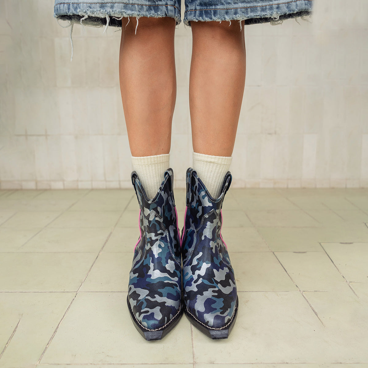 These leather ankle cowboy boots feature a striking color scheme that captures attention. The rich, vibrant hues create an eye-catching look, while playful pink stitching adds a whimsical touch that sets them apart. Designed for those who love expressing their individuality, this pair is perfect for elegant and playful outfits.