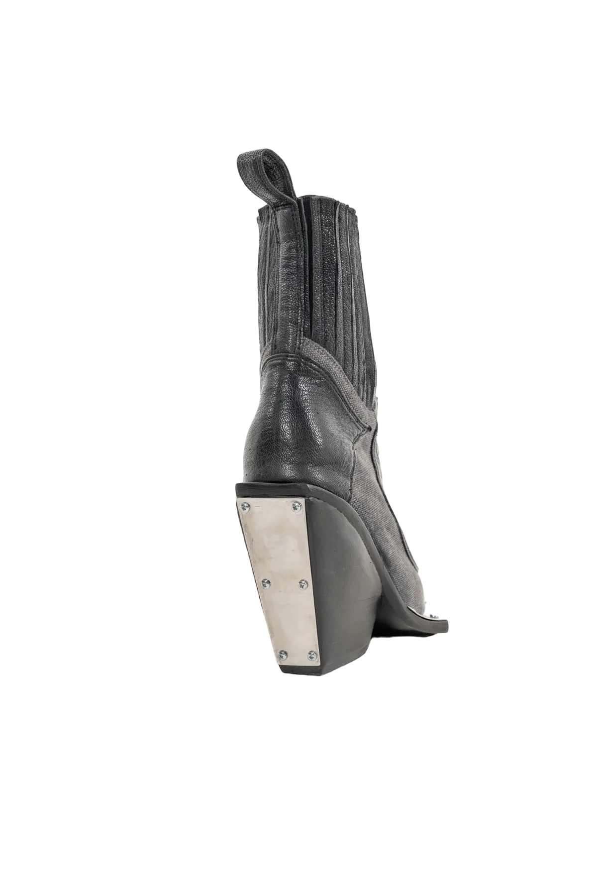 These boots showcase a pointed toe, a snug elastic ankle fit, and a distinctive asymmetric heel adorned with custom stainless steel accents on both its rear and point. It's an aesthetic that commands attention, a stunning ensemble in its own right.