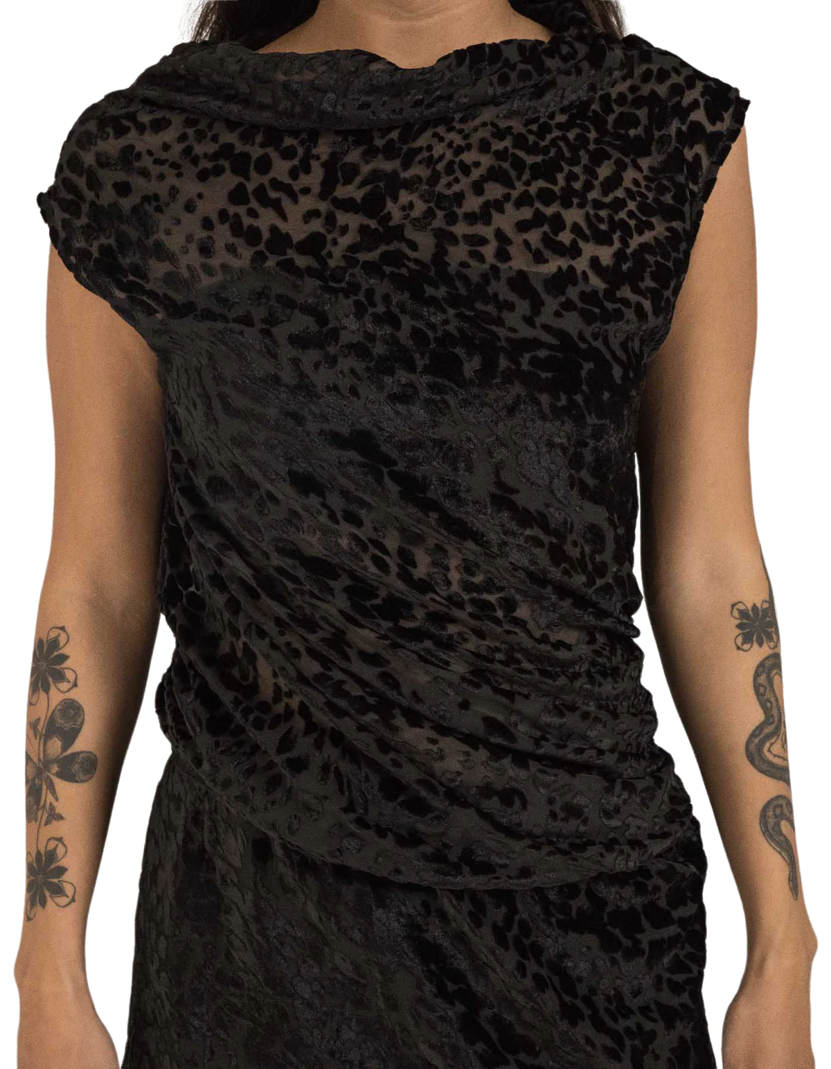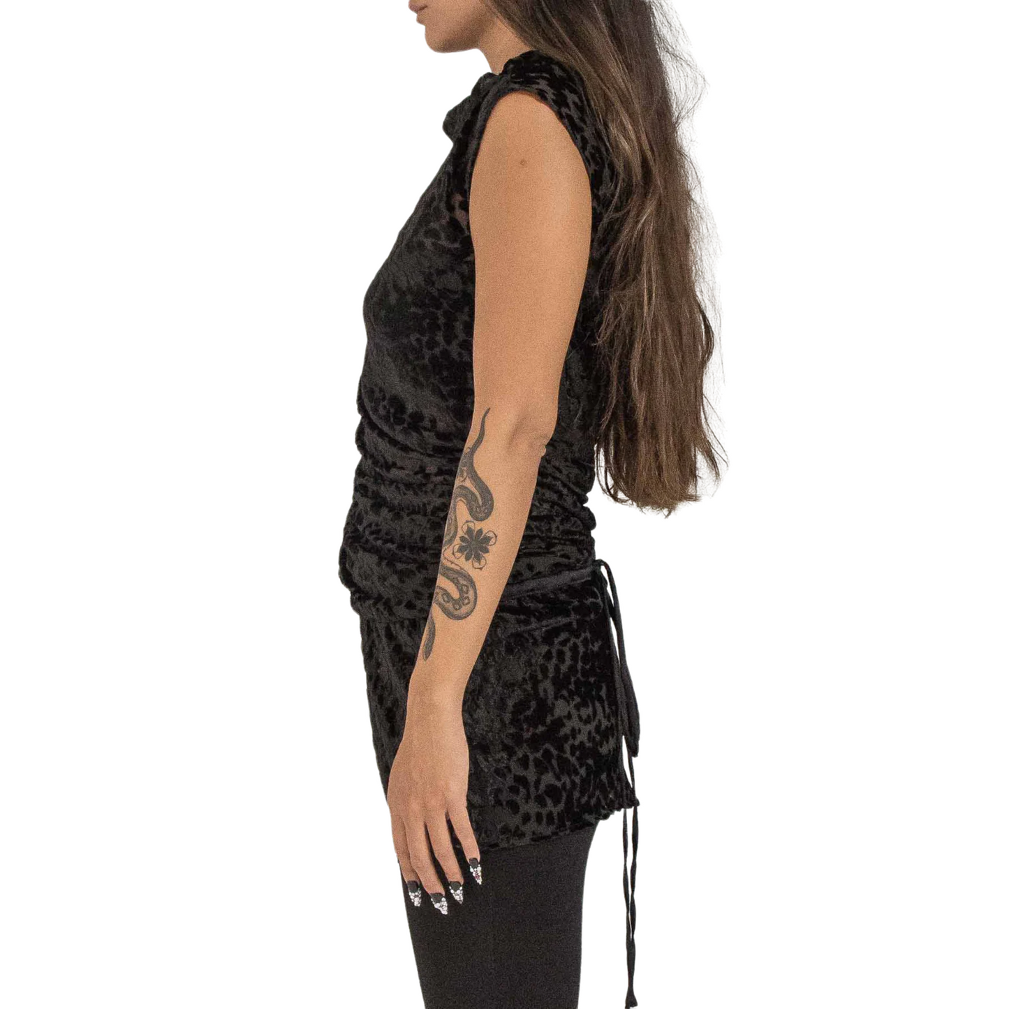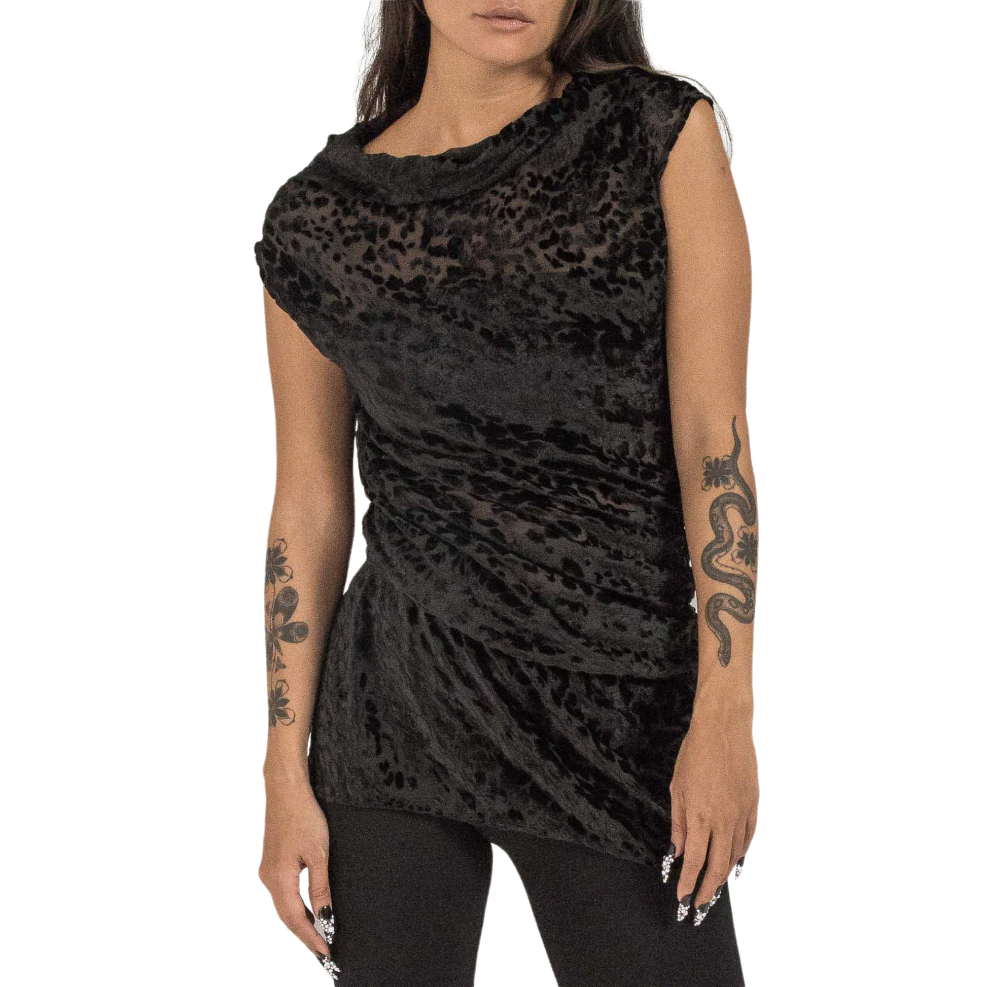 Presented in a black cheetah tone, this silk jacquard top features a turtle neck, no sleeves, a close body silhouette & a short rounded hem for simplicity with a tunnel drawstring.