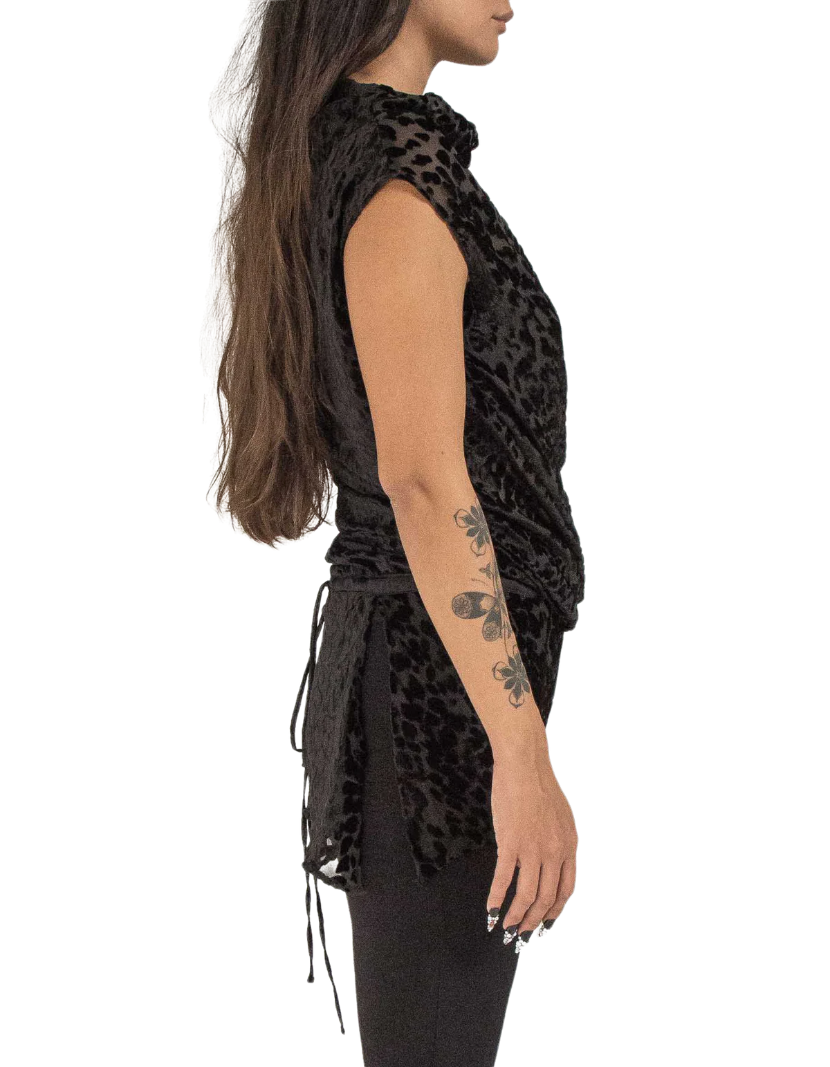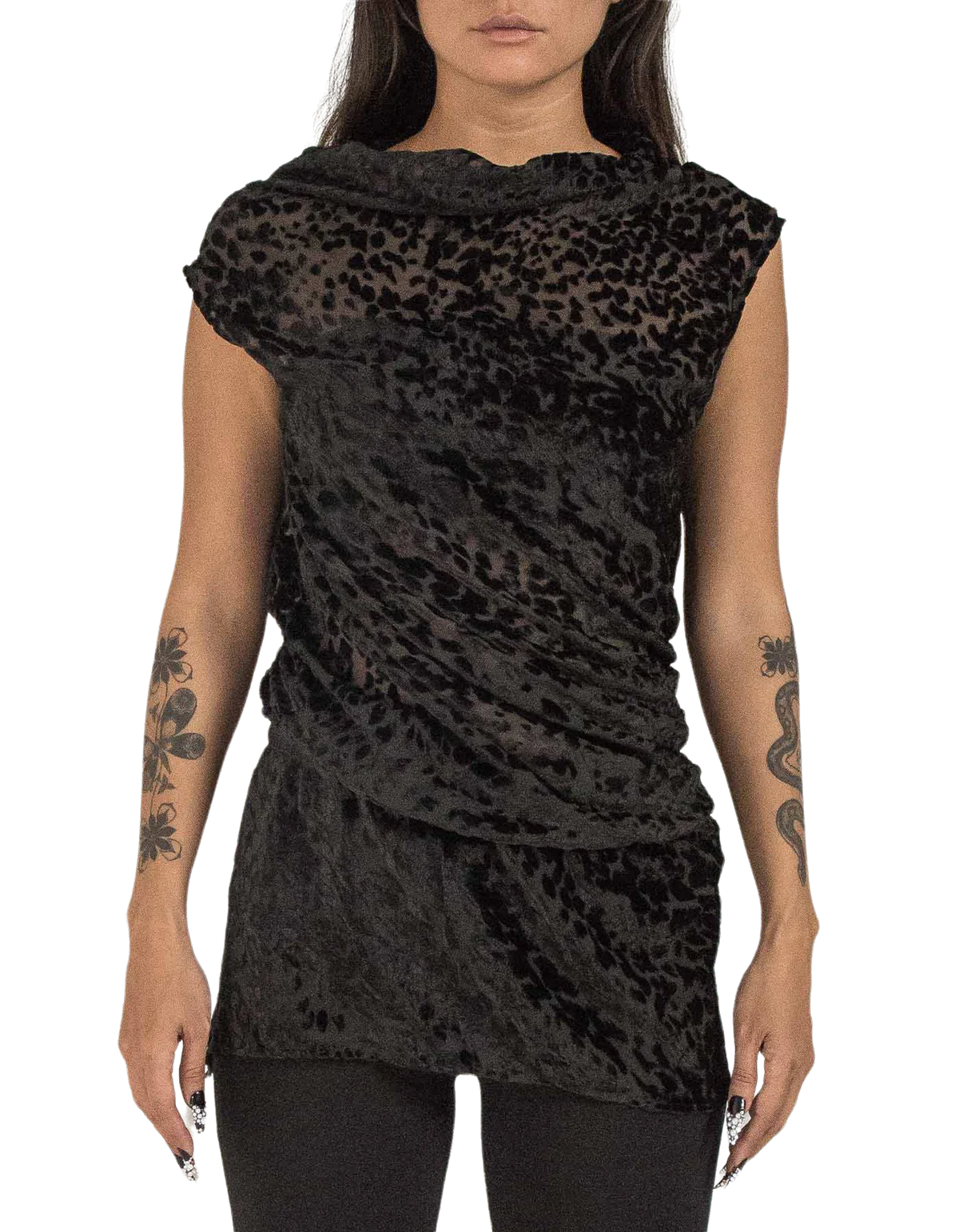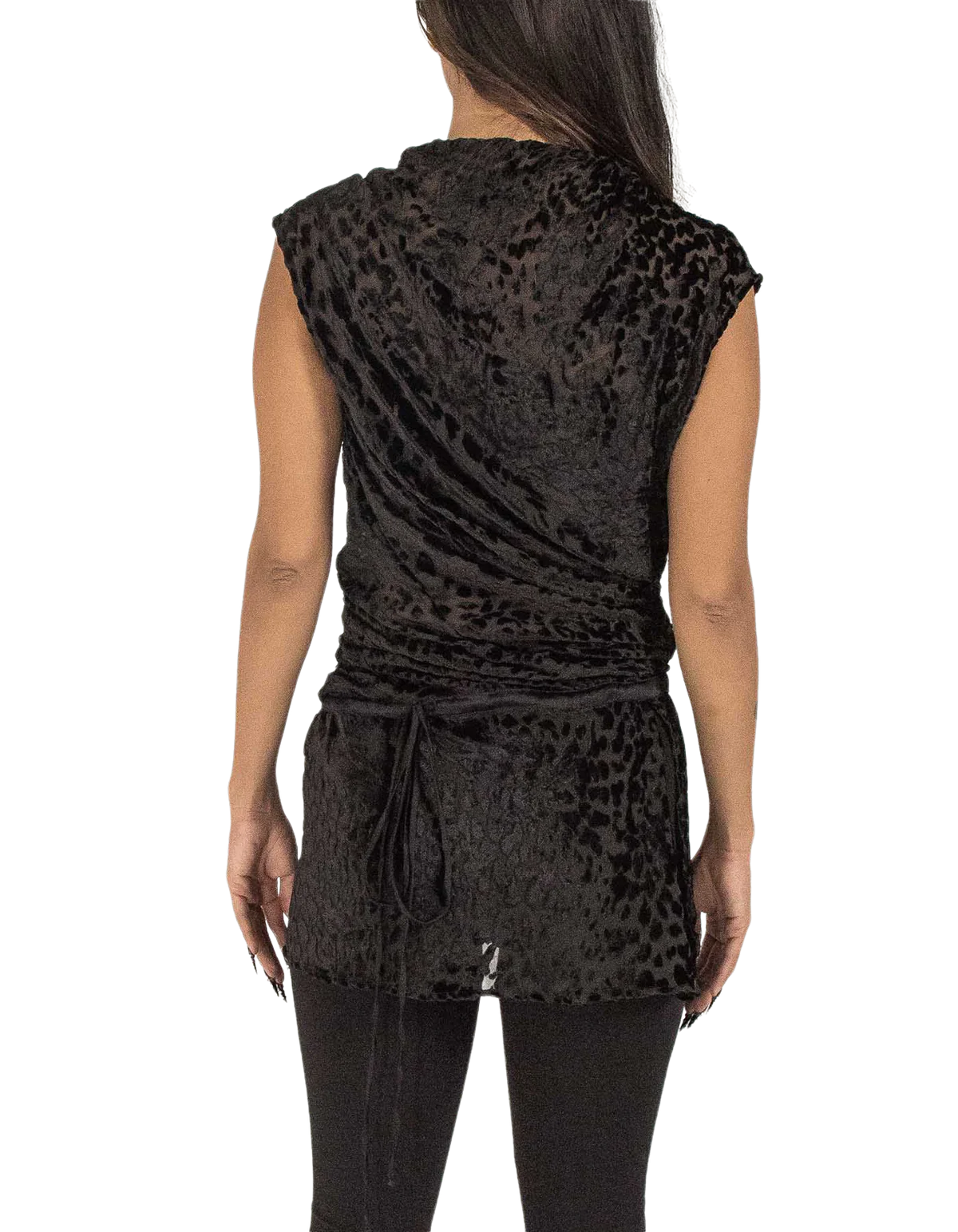 Presented in a black cheetah tone, this silk jacquard top features a turtle neck, no sleeves, a close body silhouette & a short rounded hem for simplicity with a tunnel drawstring.
